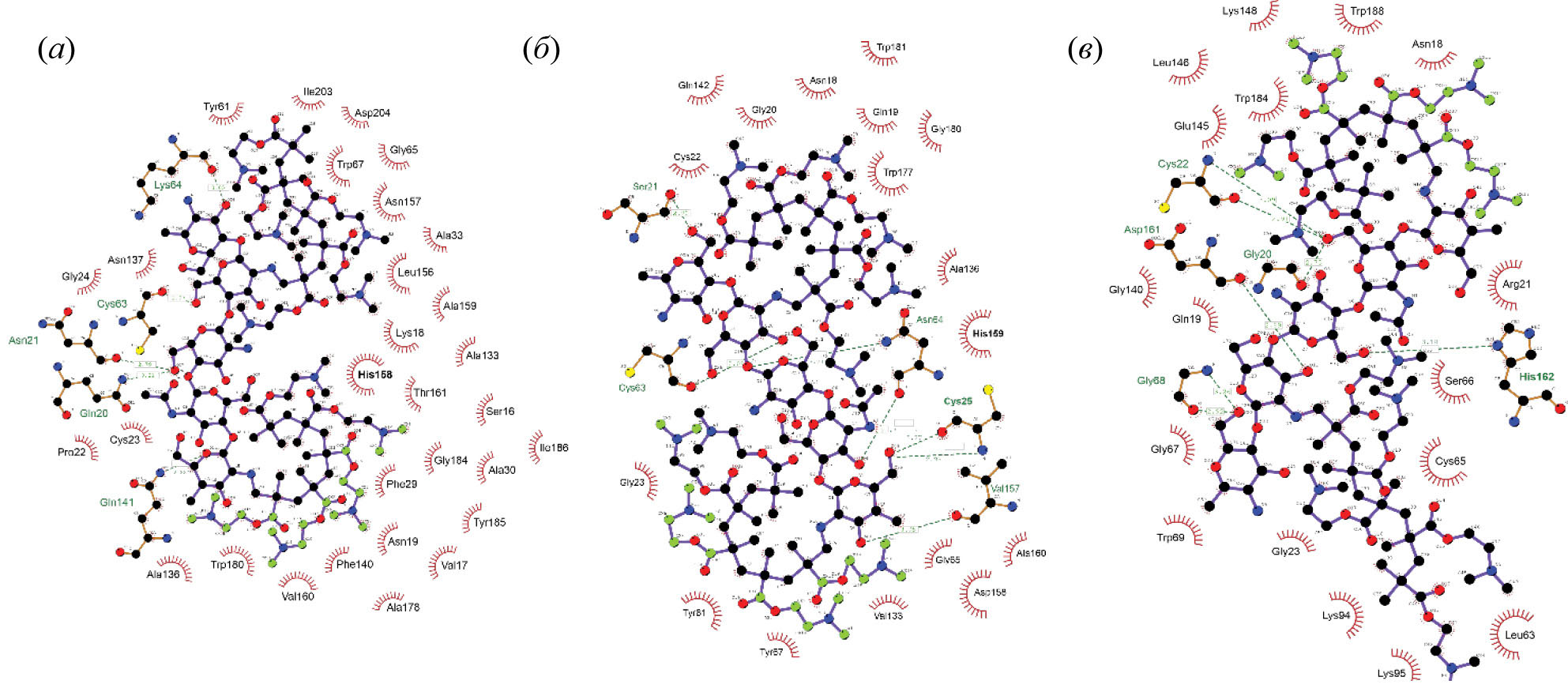 Рис. 4. Связи и взаимодействия между бромелином (а), папаином (б) и фицином (в) и привитым сополимером хитозана и поли-N,N-диметиламиноэтилметакрилата (пунктирными линиями обозначены водородные связи, длина связей приведена в ангстремах). Каталитически значимые остатки выделены полужирным шрифтом.