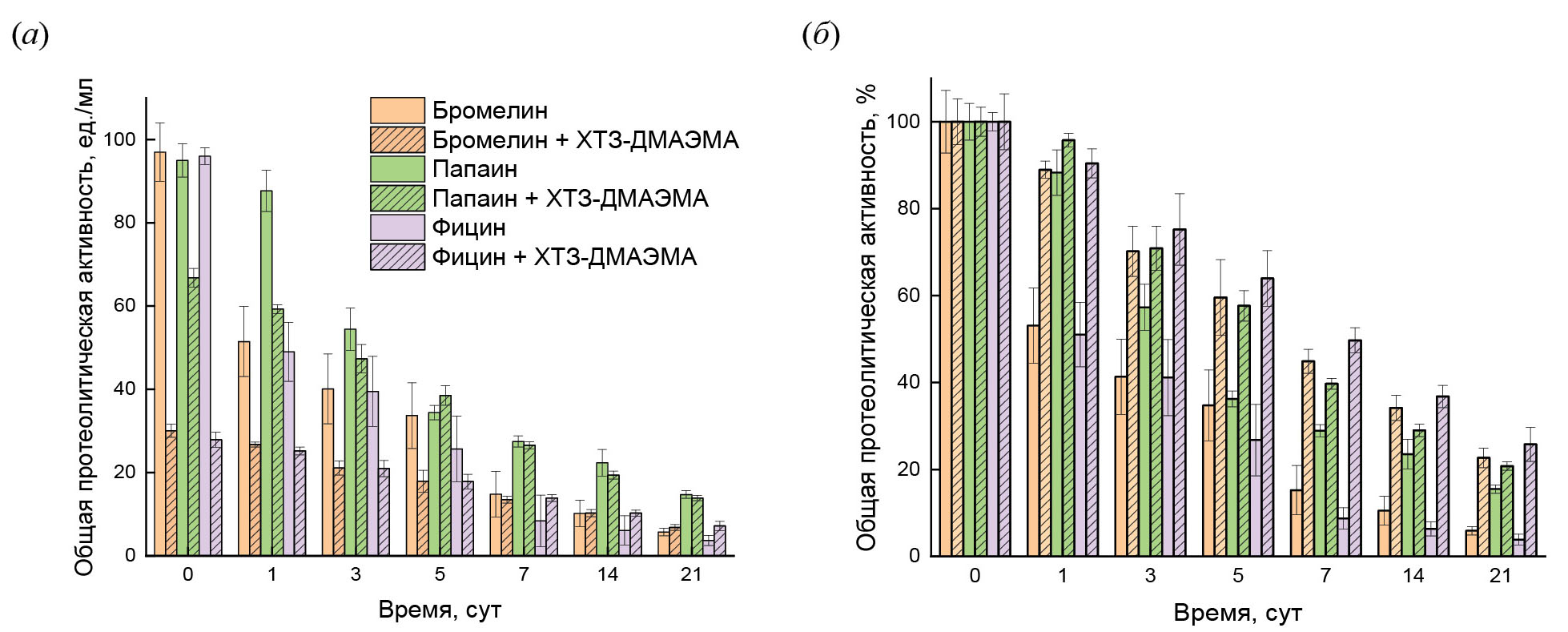Рис. 5. Остаточная каталитическая активность ферментов после инкубации образцов при 37°С: в ед./мл раствора (а) и в процентах от первоначального уровня (б). Легенда для обеих диаграмм приведена на рис. 5а.