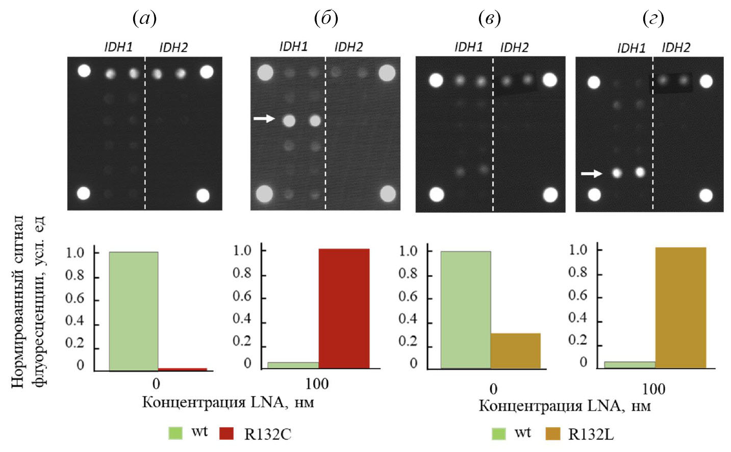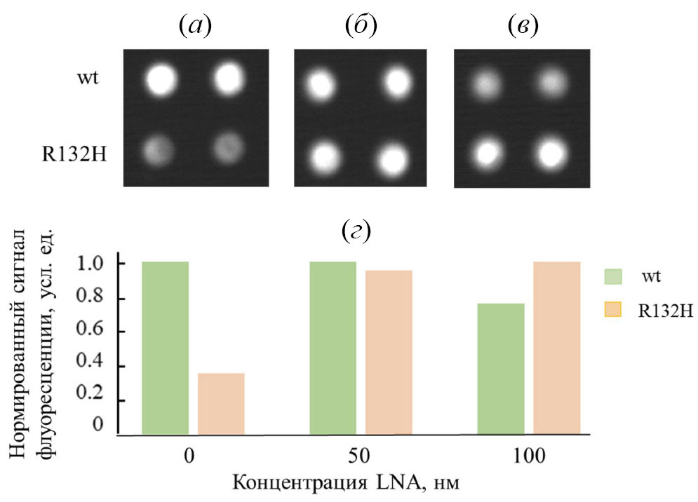 Рис. 3. Детекция мутации R132H IDH1 в образце, содержащем 0.5% мутантного аллеля, при различных концентрациях LNA-олигомера. Картины гибридизации: (а) – 0 нМ LNA, (б) – 50 нМ LNA, (в) – 100 нМ LNA; (г) – нормированные значения флуоресцентных сигналов.