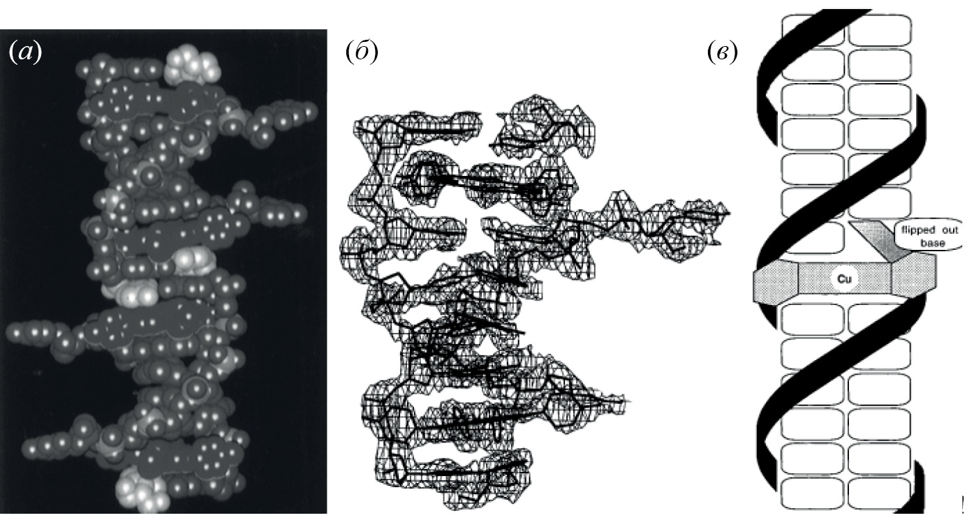 Рис. 6. (а) – Изображение непрерывной спирали, наблюдаемое в кристалле d(CGATCG)·CuTMPyP4; (б) – суммарная электронная плотность комплекса d(CGATCG)–CuTMPyP4; (в) – модель комплекса d(CGATCG)·CuTMPyP4 [58].