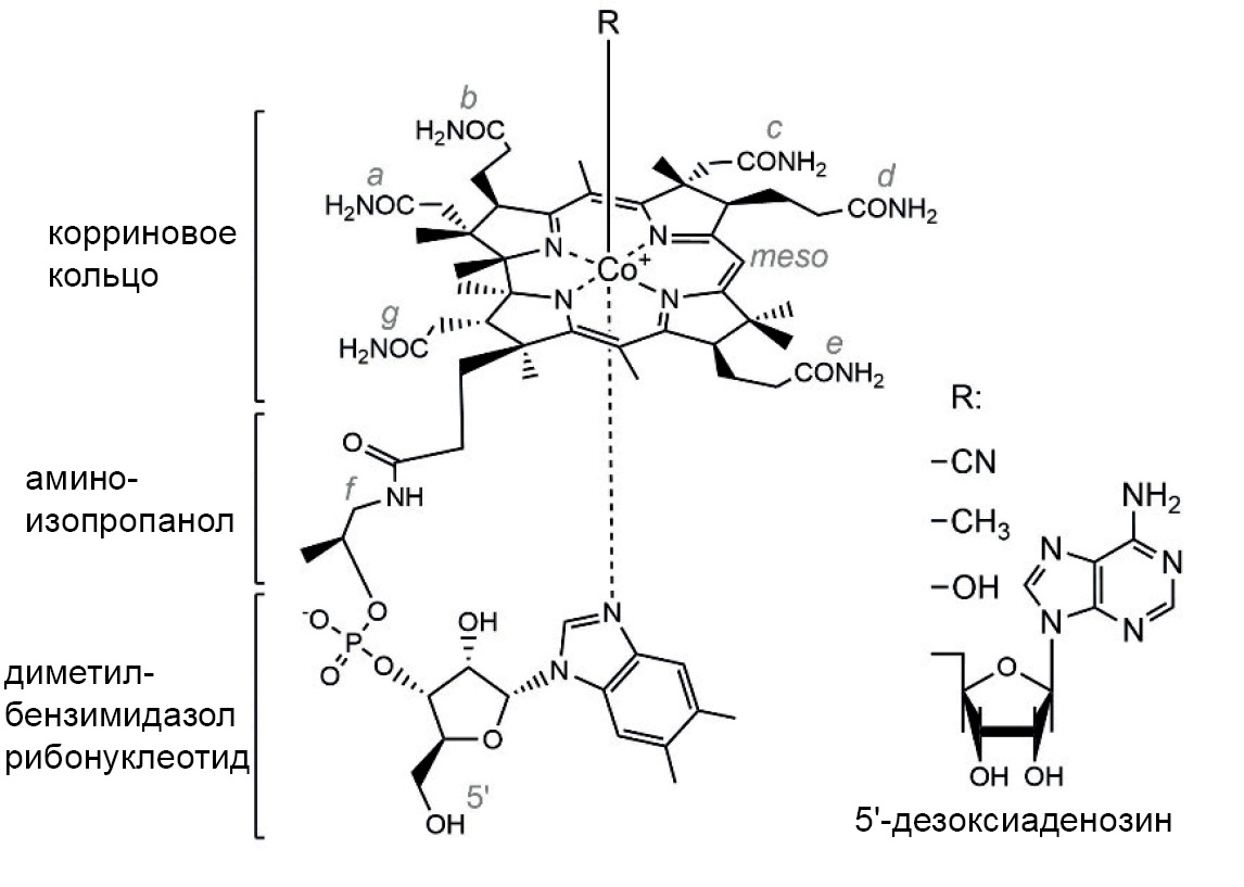 Часть молекулы В12, связанная с кобальтом (корриновое кольцо), имеет плоское строение. В перпендикулярной плоскости расположен нуклеотидный фрагмент. Образованная структура носит название кобаламина. Шесть ковалентных связей кобальта распределены следующим образом: четыре связи – с атомами азота корринового кольца, одна связь – с азотом в нуклеотидном фрагменте, а шестая связь – с цианогруппой (для цианокобаламина), метильной группой (для метилкобаламина) и т.д. [12].