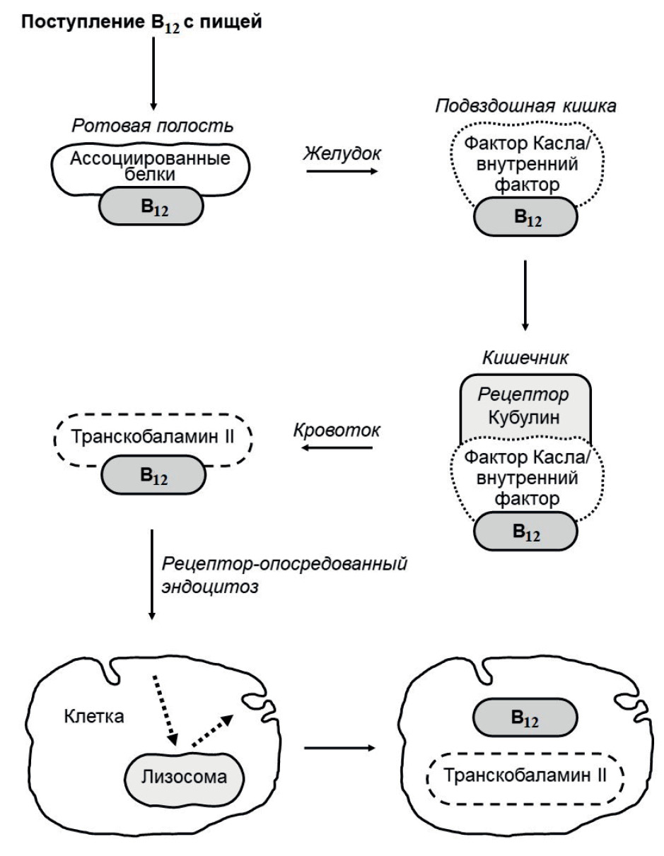 Комплекс В12–транскобаламин I разрушается панкреатическими ферментами в двенадцатиперстной кишке. Путем пассивной диффузии энтероциты поглощают не более 2% В12, поэтому ключевым аспектом, усиливающим дальнейший транспорт витамина, является образование его комплекса с гликопротеином внутренним фактором (фактором Кастла), который кодируется геном CUBN. Внутренний фактор обеспечивает поглощение В12 путем рецептор-опосредованного эндоцитоза на апикально экспрессируемом рецепторе (кубулин). При дефиците или в отсутствие фактора Кастла в значительной степени снижается эффективность всасывания витамина В12.
