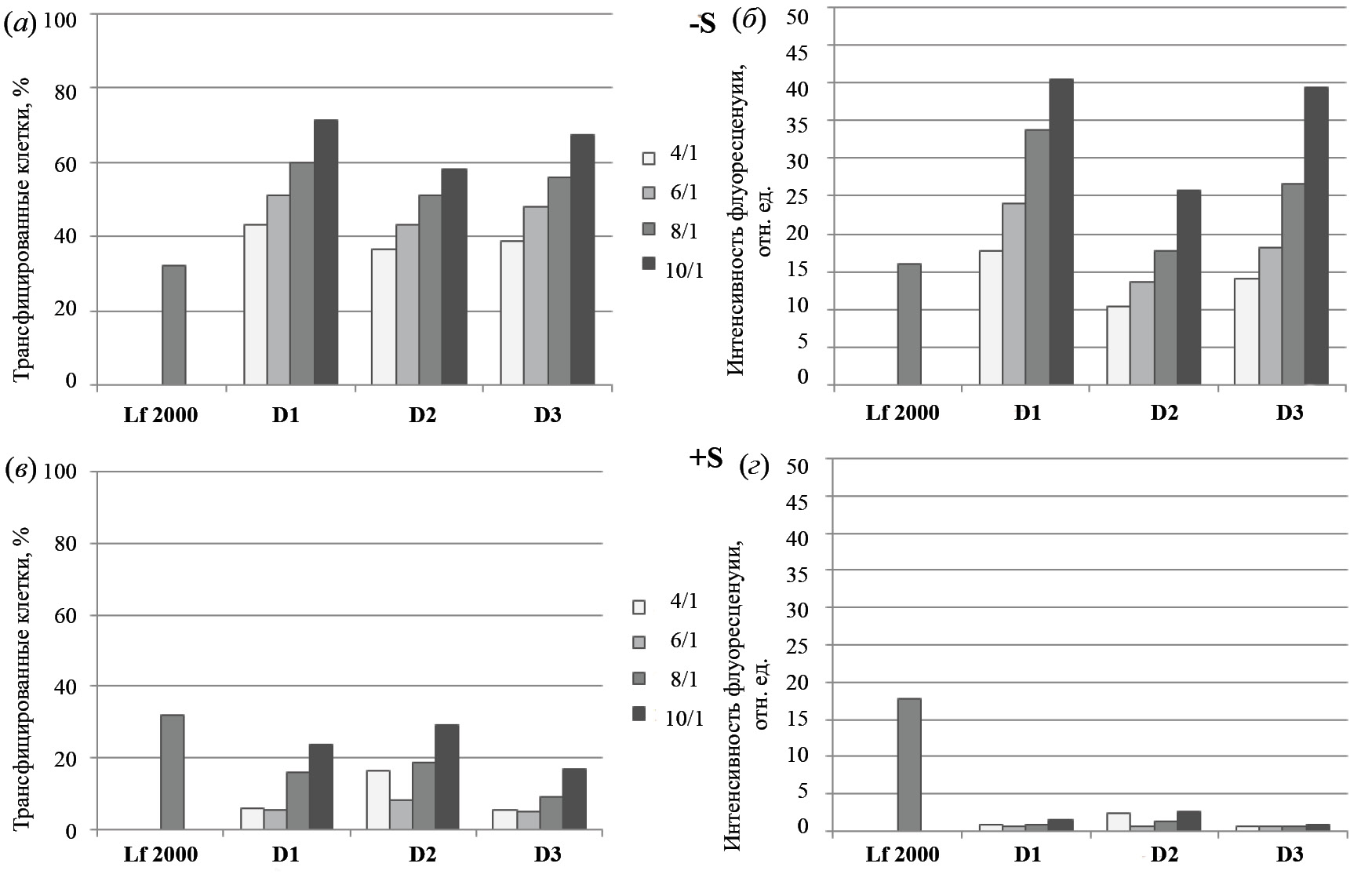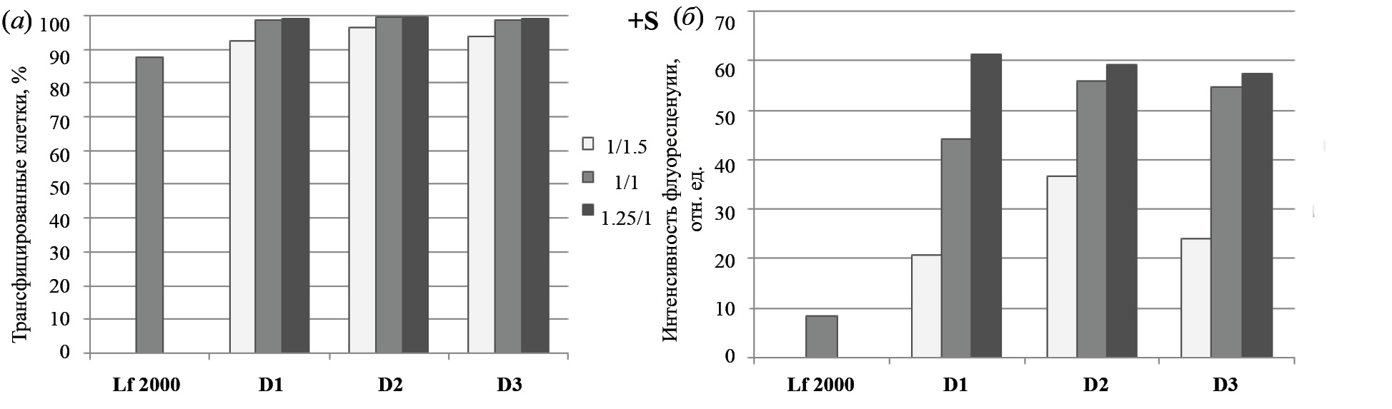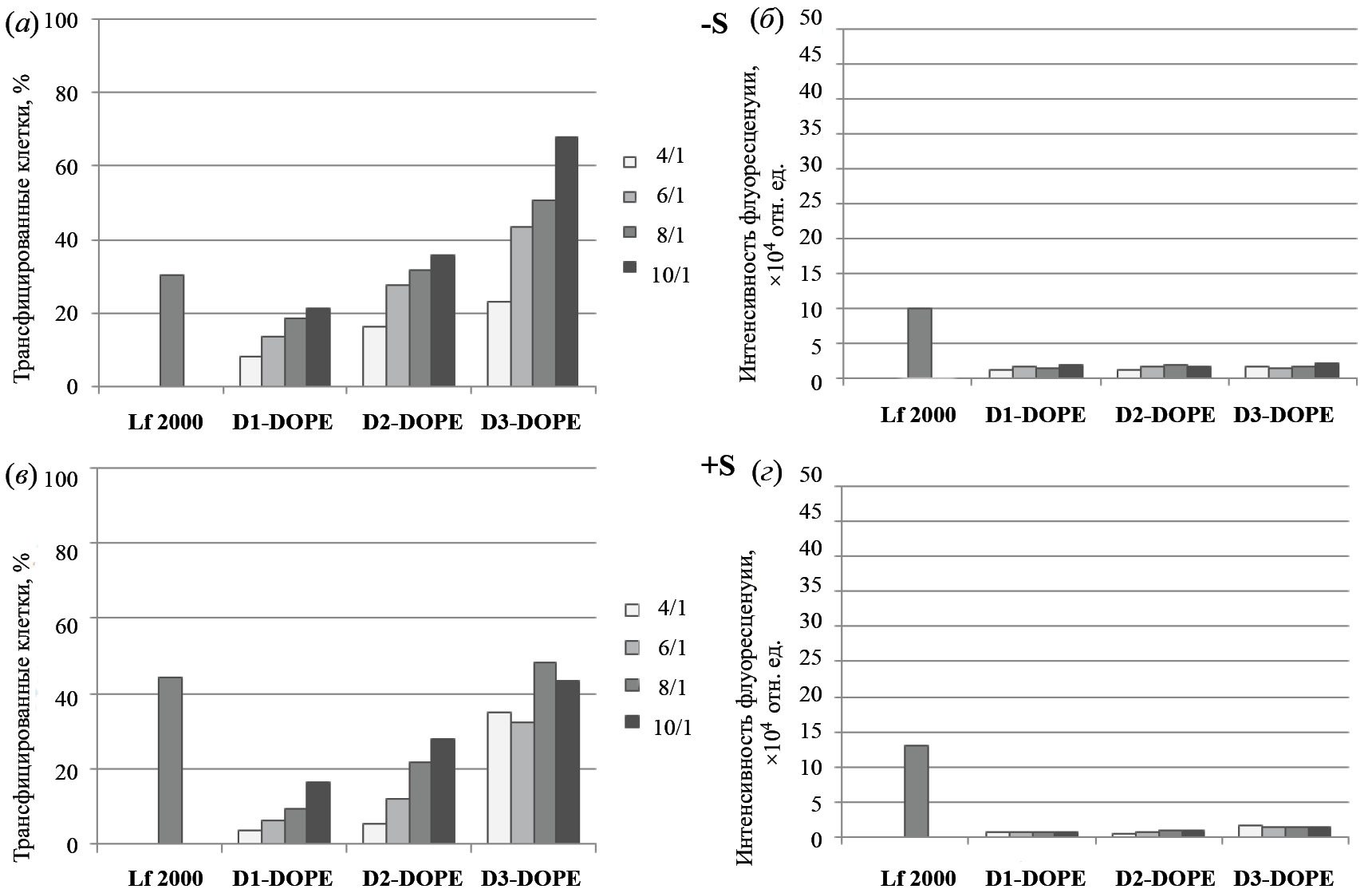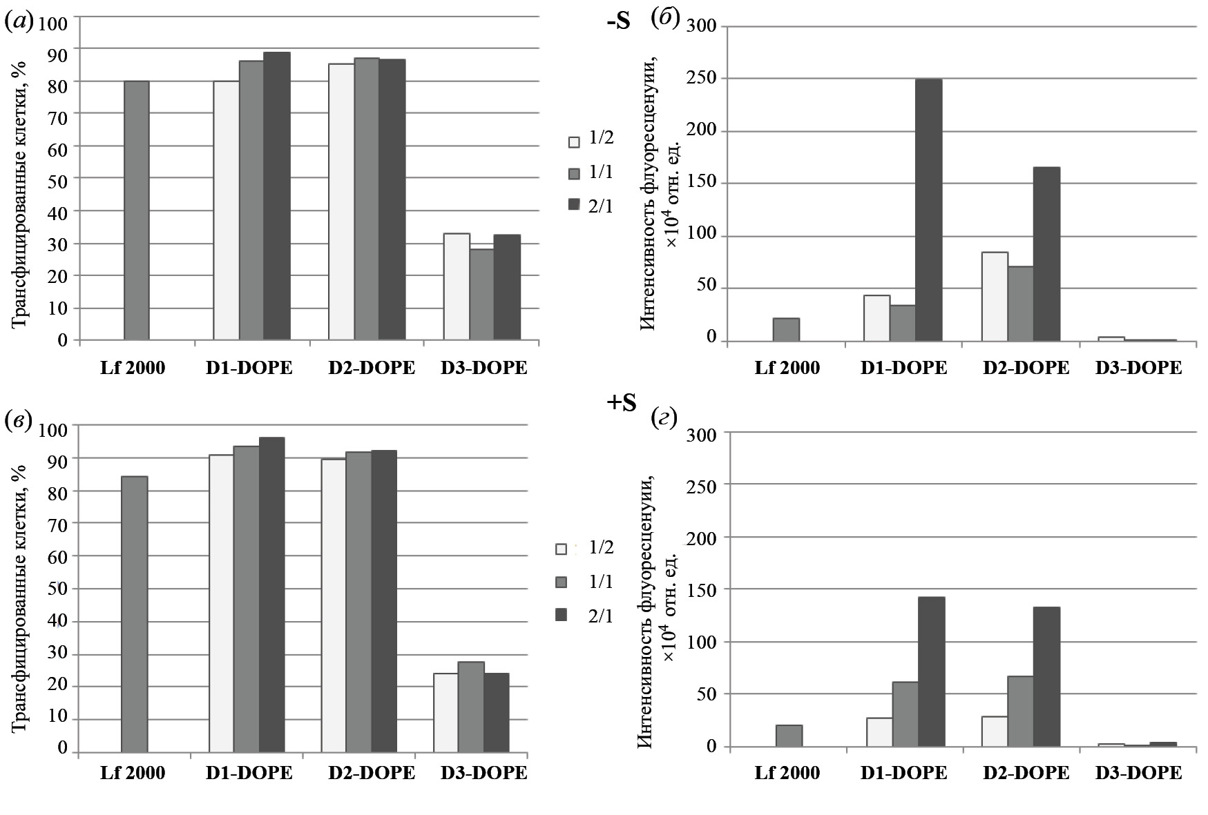 Комплексы FITC-ODN с катионными амфифилами или липосомами формировали при различных соотношениях N/P (отношение количества аминогрупп катионного амфифила D1–D3 к количеству фосфатных групп НК). Оценку эффективности трансфекции клеток НЕК 293 в отсутствие (–S, рис. 4а, 4б) и в присутствии (+S, рис. 3а, 3б, 4в, 4г) 10% FBS проводили методом проточной цитометрии путем измерения количества FITC-положительных клеток (рис. 3а, 4а, 4в) и средней интенсивности флуоресценции клеток в популяции (рис. 3б, 4б, 4г).
