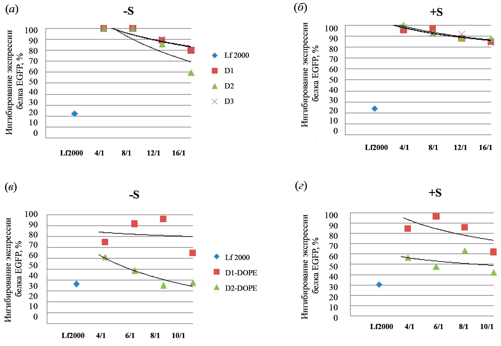 Рис. 7. Ингибирование экспрессии белка EGFP в трансгенных клетках BHK IR-780 после доставки siРНК с помощью катионных амфифилов D1–D3 (а, б) или катионных липосом D1-DOPE и D2-DOPE (в, г) в отсутствие (а, в) или в присутствии 10% FBS (б, г) в клеточной среде.