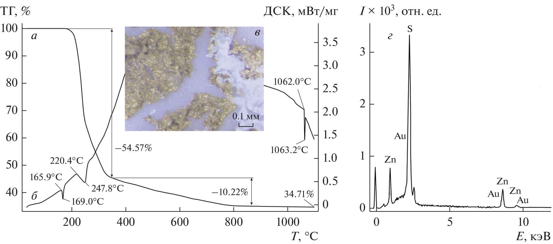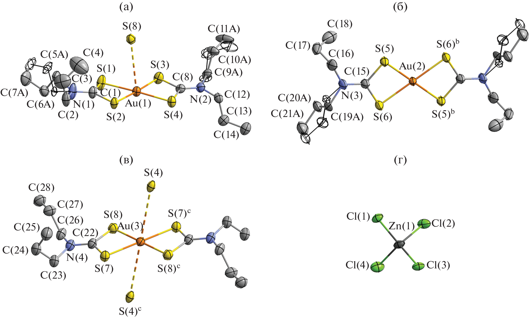The reaction of binuclear zinc dipropyldithiocarbamate [Zn2{S2CN(C3H7)2}4] with an AuCl3/2 М HCl solution is studied. The double ionic complex [Au{S2CN(C3H7)2}2]2[ZnCl4] (I) is identified as the main species of gold(III) binding in the heterogeneous system under study and is characterized by 13С and 15N CP-MAS NMR spectroscopy. Single crystals of heterovalent compound [Au{S2CN(C3H7)2}2]2[AuCl4][AuCl2] (II) are sampled as a by-product. The crystal and supramolecular structures of complexes I and II are determined by the direct XRD method (CIF files CCDC nos. 2159171 and 2159170, respectively). The self-organization of the complex pseudopolymeric structures of compounds I and II are shown to be due to the binding of ionic structural units by secondary nonvalent interactions Au⋅⋅⋅S and S⋅⋅⋅Cl and hydrogen bonds C–H⋅⋅⋅Cl. The thermal behavior of the complexes is studied by simultaneous thermal analysis (STA), and the quantitative regeneration of bound gold (I and II) with the partial transformation of released ZnCl2 to ZnS (I) is found.