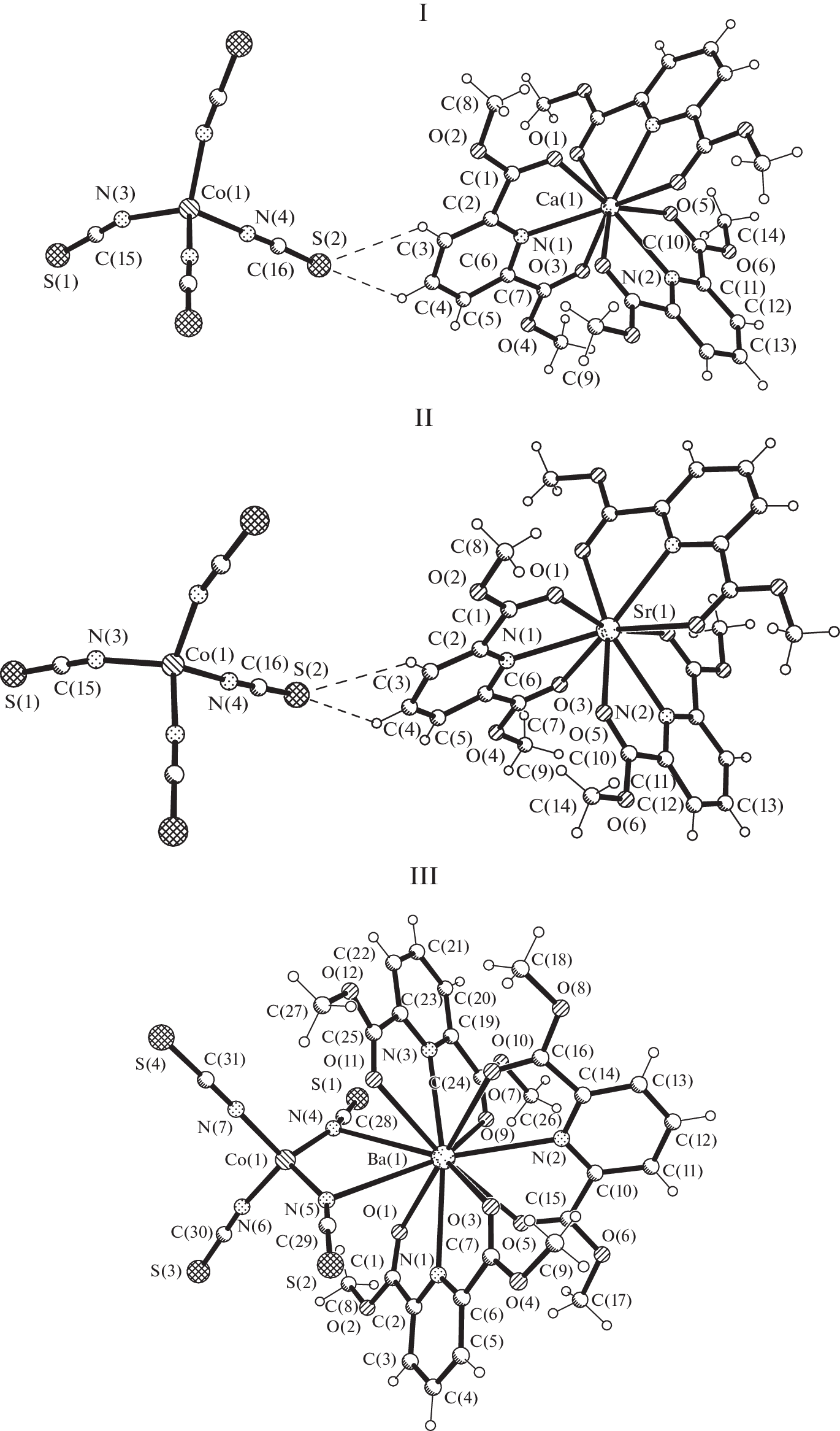 Dimethyl pyridine-2,6-carboxylate (L) was prepared by refluxing pyridine-2,6-dicarbonyl dichloride in methanol. The reactions of L with Ca(II), Sr(II), and Ba(II) salts and with cobalt(II) thiocyanate resulted in the formation of three heterometallic complexes: [CaL3][Co(NCS)4] (I), [SrL3][Co(NCS)4] (II), and [BaCoL3(μ-NCS)2(NCS-κN)2] (III). The composition and structure of compounds L and I–III were determined by elemental analysis, infrared spectroscopy, and X-ray diffraction (CCDC nos. 2166019–2166022, respectively). It was found that isostructural Ca(II) and Sr(II) compounds are ionic and are formed by the [CaL3]2+ and [SrL3]2+ complex cations and [Co(SCN)4]2– complex anion, while the Ba(II) derivative is a molecular complex in which [BaL3]2+ and [Co(NCS)4]2– moieties are linked by two (NCS)– bridging units of the complex anions. In any of the three compounds, three tridentate L ligands are coordinated to the alkaline earth metal ion.