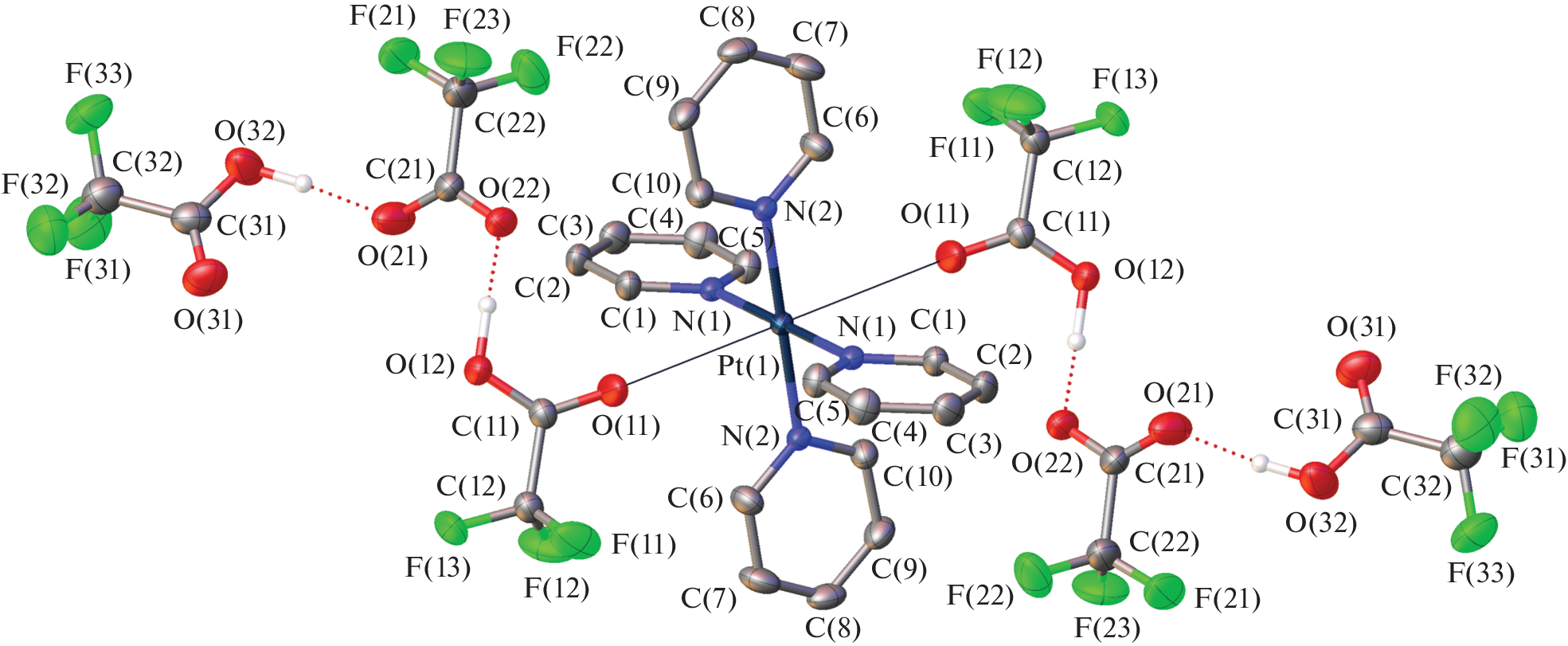 A series of mono- and bimetallic cation-anionic complexes based on the [PtPy4]2+ cation with different single-charge anions of carboxylic acids (RCOO–) is synthesized and structurally characterized. A synthetic approach to the preparation of tetrapyridineplatinum complexes [PtPy4]2+ soluble in polar solvents from available reagents is developed. The reaction of tetrapyridineplatinum dichloride [PtPy4](Cl)2 with silver acetate or trifluoroacetate affords compounds [PtPy4](OOCMe)2·6H2O (I) and [PtPy4](OOCCF3)2· 2H2O (II) in the form of crystalline hydrates (CIF files CCDC nos. 2161100 and 2161101, respectively) in high yields. Other carboxylates can be prepared by the treatment of compound I with an excess of a stronger acid, for example, trifluoroacetic acid, with the formation of the corresponding complex trifluoroacetate [PtPy4](OOCCF3)2·4CF3COOH (IIa) (CIF file CCDC no. 2161102). Another method consists of the displacement of acetic acid with an excess of a lowly volatile acid, for example, pivalic acid, when [PtPy4](Piv)2· 5HPiv (III) is formed from the acid melt, and solvatomorph [PtPy4](Piv)2·4HPiv·3C6H12 (IIIa) (CIF files CCDC nos. 2161103 and 2161104, respectively) is formed in a cyclohexane medium. Heteroanionic heterometallic complex [PtPy4](OOCFc)(OOCMe) (IV) (CIF file CCDC no. 2161105) is shown to be formed by the reaction of complex I with ferrocenecarboxylic acid under mild conditions.