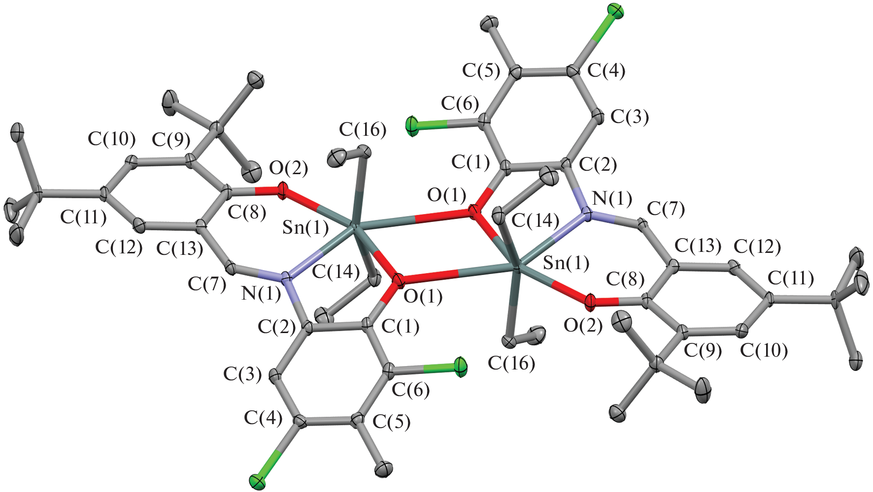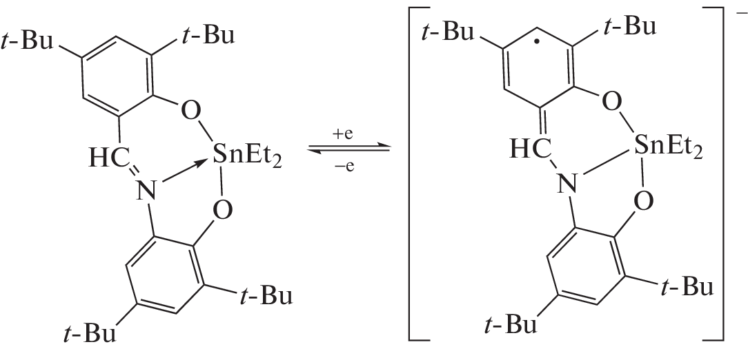 New tin(IV) complexes with O,N,O'-donor Schiff bases (L1H2–L4H2) of the (Ln)SnR2 type (R = Ph (I–III), Et (IV–VII)) are synthesized and characterized. The molecular structures of compounds I–III, VI, and VII in the crystalline form are determined by X-ray diffraction (XRD) (CIF files CCDC nos. 2181140 (I), 2181142 (II), 2181143 (III∙CH3CN), 2181141 (VI), and 2181139 (VII)). Tin complexes I–III and VI are mononuclear pentacoordinate compounds. Crystalline complex VII forms dimers via the pairwise bridging coupling between the oxygen and tin atoms of the mononuclear fragments. The redox-active ligand in the synthesized compounds exists as the iminobis(phenolate) dianion. The electrochemical properties of free ligands and complexes I–VII are studied. In the case of compounds I, II, IV, and V with tert-butyl substituents in the redox-active ligand, the formation of relatively stable monocationic and monoanionic species is electrochemically detected for the first time. The presence of the electroactive nitro group results in the destabilization of the oxidized forms of the complexes and induces the appearance of an additional peak in the cathodic range. The energy gaps between the frontier redox orbitals are determined by the electrochemical and spectral methods. The obtained parameters are close and vary in a range of 2.43–2.68 eV.