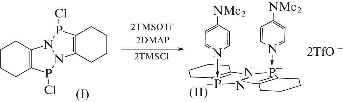 The reactions of annulated 1,4-dichloro-3a,6a-diaza-1,4-diphosphapentalenes (DDPCl2) with 1 equiv. of trimethylsilyl triflate (TMSOTf) lead to replacement of one chlorine atom with the triflate group, thus giving cationic diazadiphosphapentalenes [ClDDP]+[TfO]−. In the presence of 2 equiv. of TMSOTf and 2 equiv. of 4‑dimethylaminopyridine (DMAP), the DDP dication stabilized by two DMAP molecules, [DDP(DMAP)2]2+[(CF3SO3)−]2, is formed. The DMAP molecules are located on one side of the DDP skeleton and lie in parallel planes. Free diazadiphosphapentalene was detected in solutions of [DDP(DMAP)2]2+[(CF3SO3)−]2 in CH2Cl2 by UV-Vis spectroscopy and CV. This implies that this compound disproportionates under these conditions; it is unstable in dilute solutions and decomposes to give [DMAP∙HOTf] in a quantitative yield. Crystallographic data for the obtained compounds: CCDC nos. 2182881–2182883.