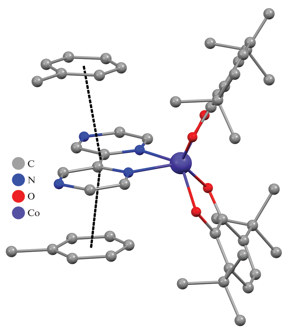 Two new cobalt bis-o-semiquinonato complexes, (Pyz-Phen)Co(3,6-DBSQ)2 (I) and (Bpyz)Co(3,6-DBSQ)2 (II) (Pyz-Phen = pyrazino[2,3-f][1,10]phenanthroline, Bpyz = bipyrazine, 3,6-DBSQ = 3,6-di-tert-butyl-o-benzoquinone radical anion), were synthesized. According to X-ray diffraction data, both complexes have a trigonal-prismatic geometry of the inner coordination sphere. The distribution of C–O and Co–O bond lengths, which reflects the valence state of the metal and the ligands, indicates that the complexes are formed by cobalt(II) surrounded by two semiquinone radical anions. The results of magnetochemical measurements show that the pyrazino[2,3-f][1,10]phenanthroline complex is a derivative of low-spin divalent cobalt, whereas its bipyrazine structural analogue is a high-spin cobalt(II) derivative.