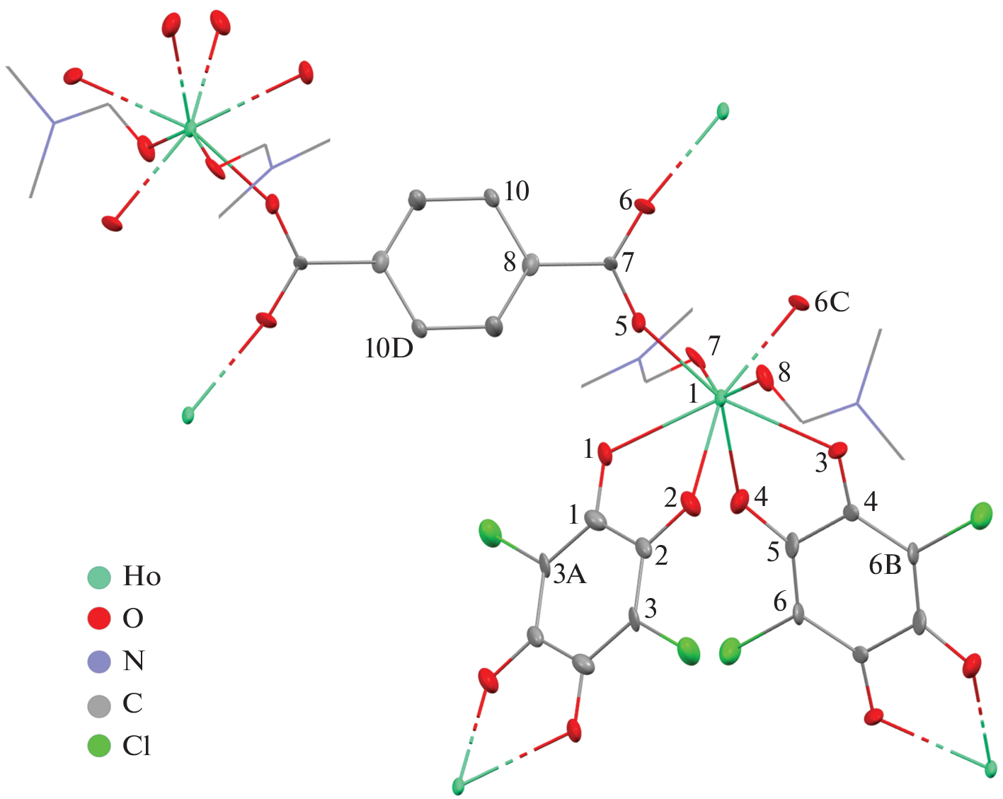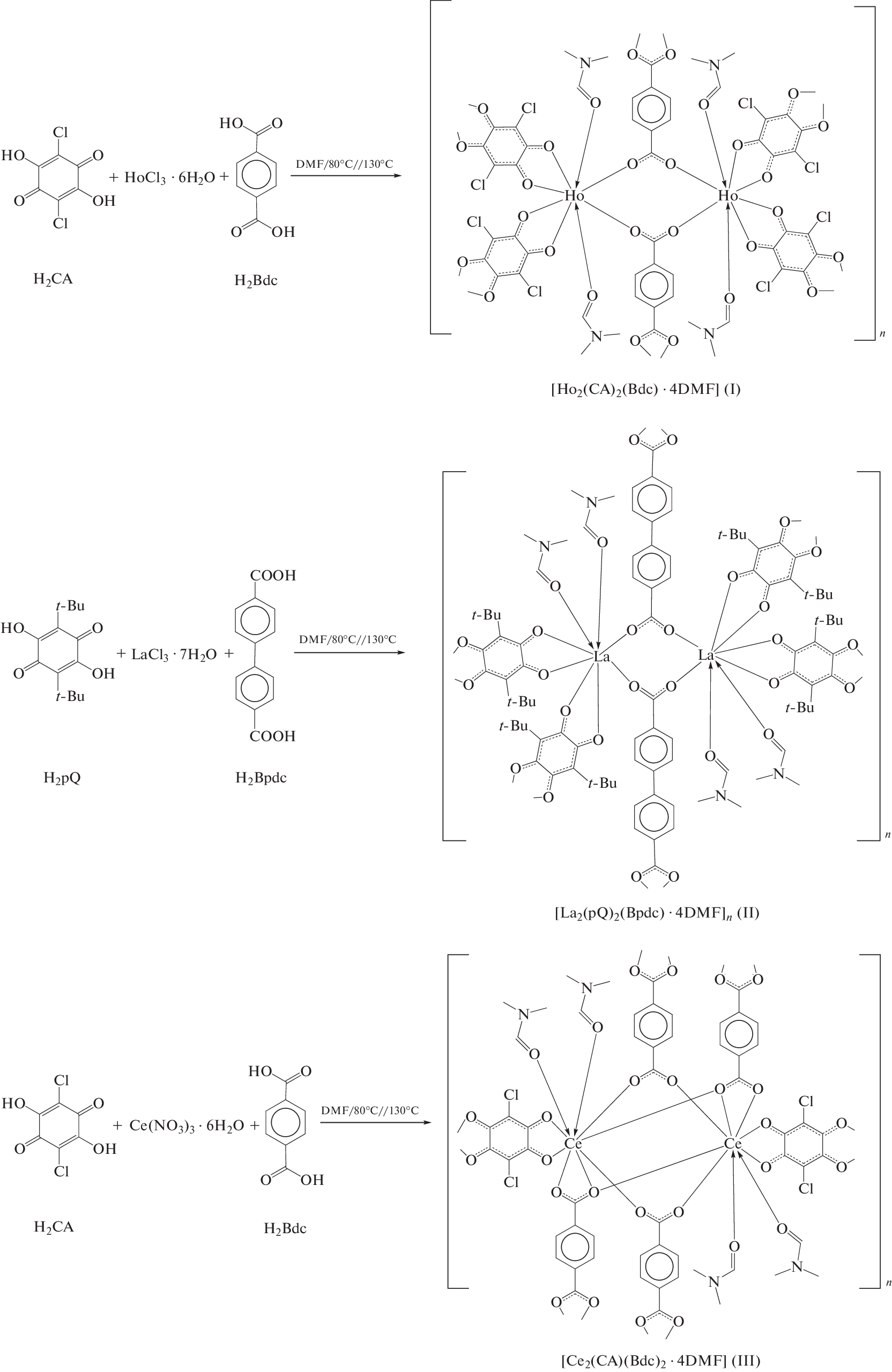 Методом сольвотермального синтеза в N,N-диметилформамиде (DMF) получены новые гетеролептические металл-органические координационные полимеры лантаноидов, содержащие в составе звена два типа анионных органических лигандов. Получены сетчатый координационный полимер [Ho2(CA)2(Bdc) · 4DMF] (I) и два каркасных производных состава [La2(pQ)2(Bpdc) · 4DMF] (II) и [Ce2(CA)(Bdc)2 · 4DMF] · 2DMF (III · 2DMF), где CA – дианион хлораниловой кислоты, pQ – дианион 2,5-ди-гидрокси-3,6-ди-трет-бутил-пара-бензохинона, Bdc – дианион терефталевой кислоты, Bpdc – дианион 4,4'-бифенилдикарбоновой кислоты. Cтруктуры I, II, III · 2DMF исследованы методом РСА (CCDC № 2212230, 2212231, 2212232 соответственно).