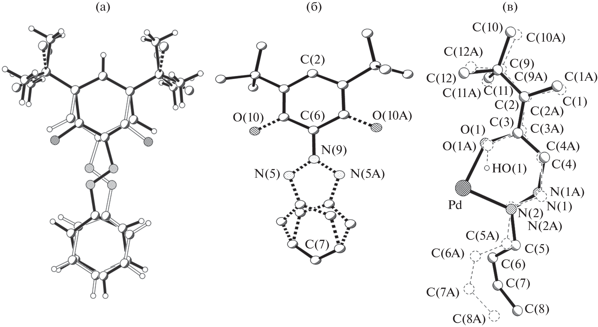 The structures of 3,5-di-(tert-butyl)-2-hydroxyazobenzene (L) in the free state and in complexes with Ni2+ (I) and Pd2+ (II) cations are studied by X-ray diffraction (XRD). The same space group R3¯с with close unit cell parameters, the same crystal structure motif, and unusual conformations of the cupola-shaped coordination polyhedra of complexes I and II are revealed by XRD for ligand L. In complexes I and II based on this compound as the ligand, the coordinating atoms form trans-planar coordination nodes.