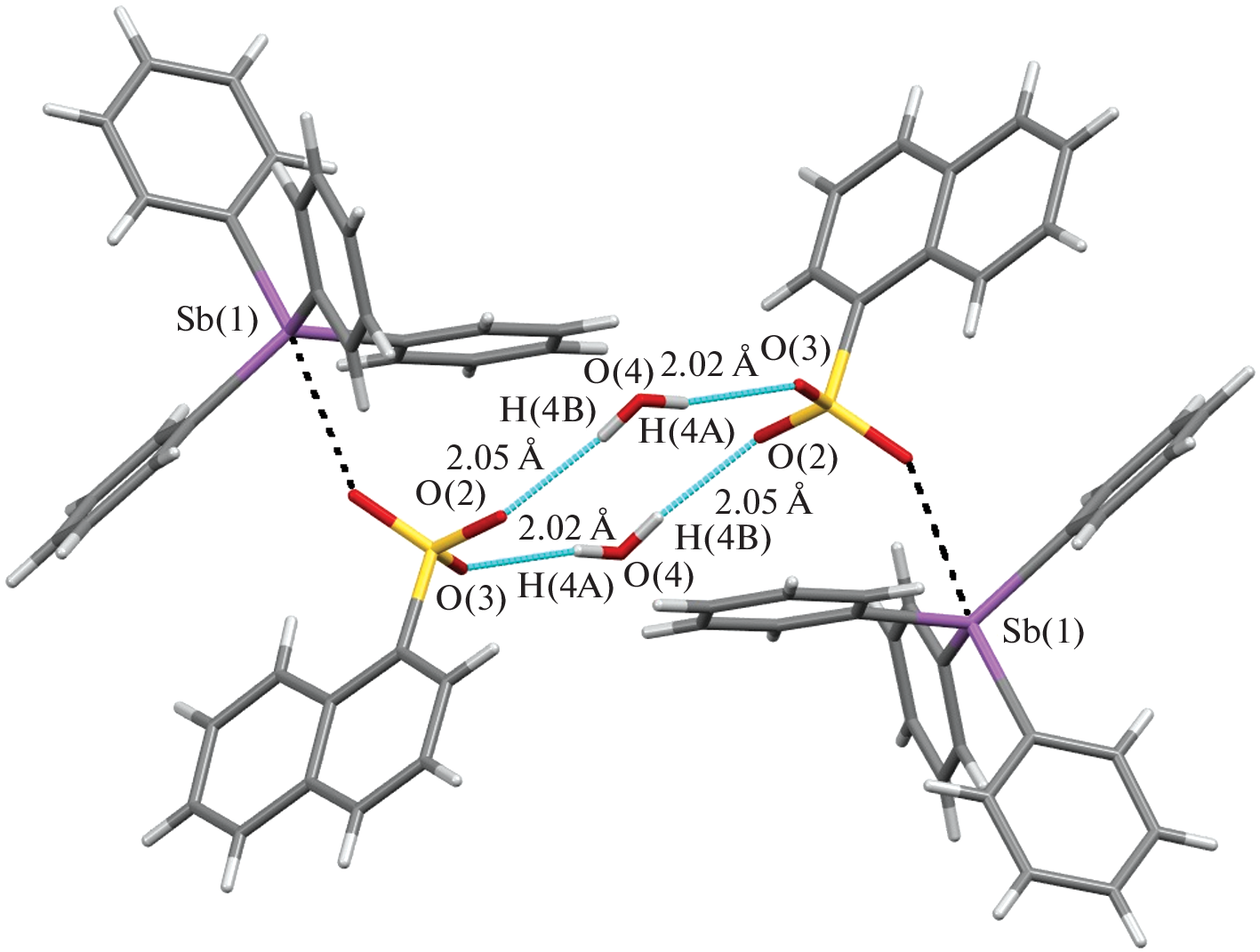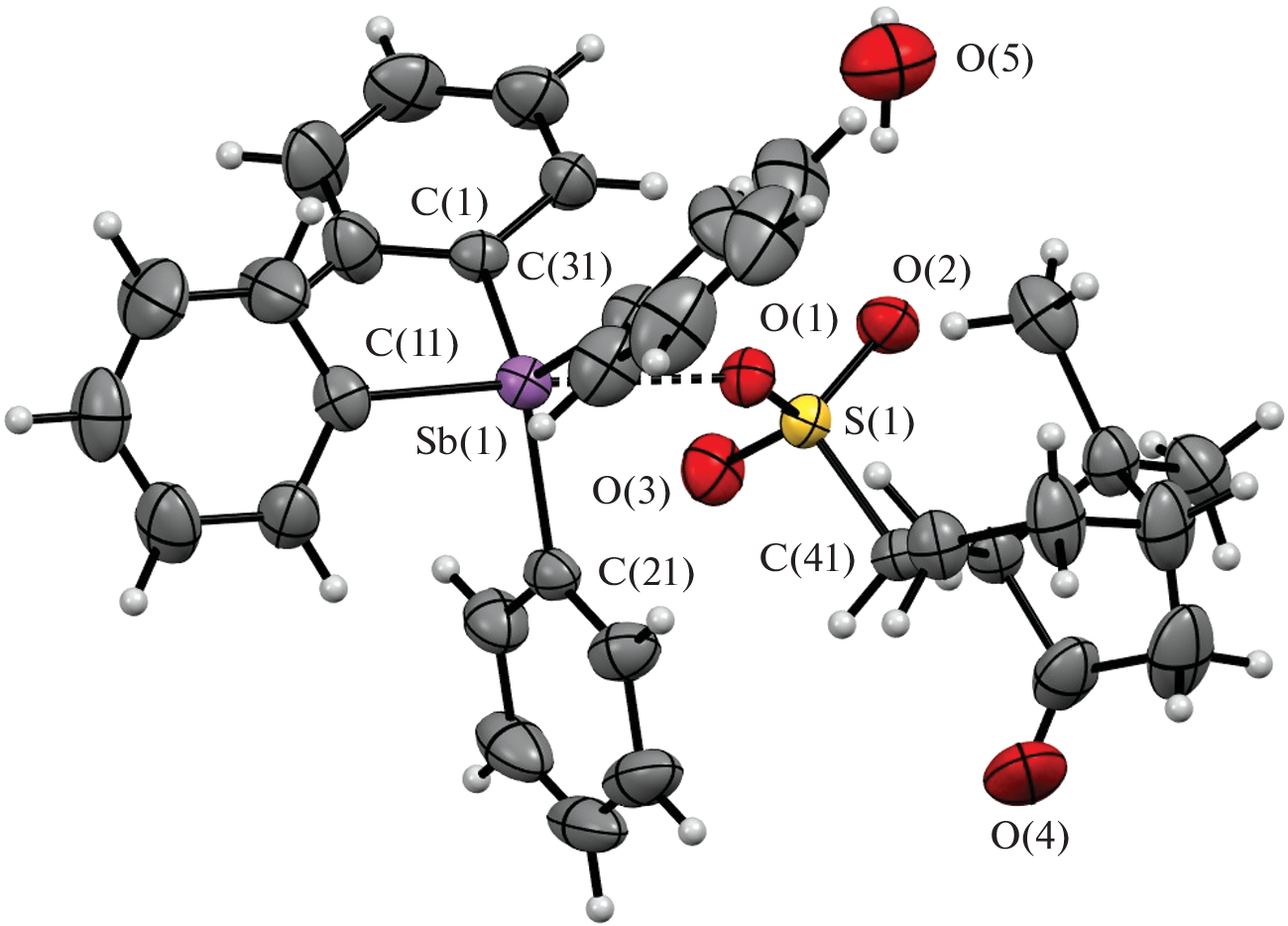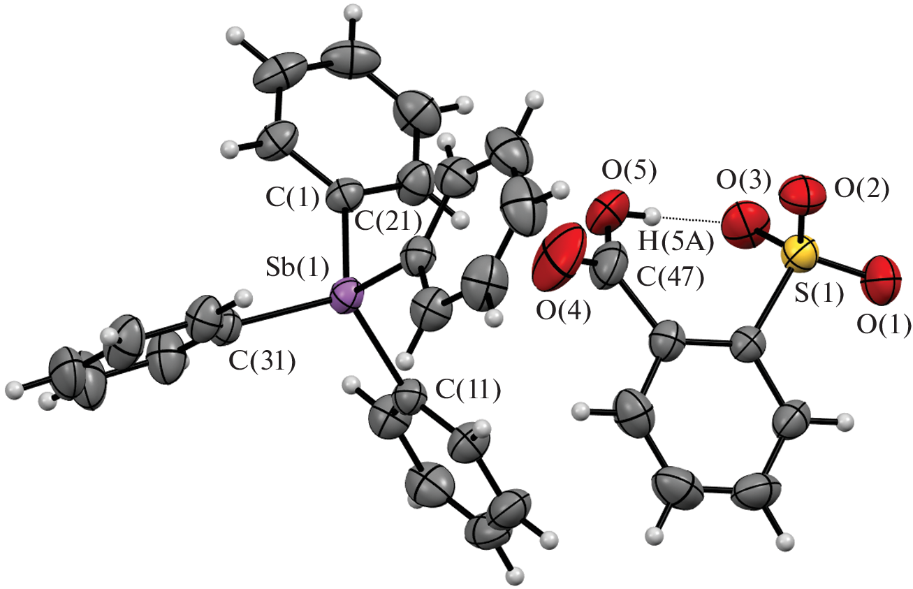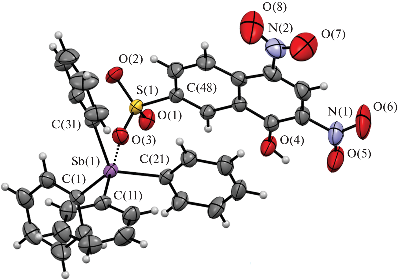 The reaction of equimolar amounts of pentaphenylantimony with camphor-10-sulfonic, 2,4-dinitro-1-naphthol-7-sulfonic (flavianic), 1-naphthalenesulfonic, and 2-sulfobenzoic acids in benzene resulted in the synthesis of tetraphenylstibonium organosulfonates Ph4SbOSO2C10H15O∙H2O (I), Ph4SbOSO2C10H4(OH-1)(NO2)2-2,4∙PhH (II), Ph4SbOSO2(C10H7-1)∙H2O (III), and Ph4SbOSO2C6H4(COOH-2) (IV). According to X-ray diffraction data (CCDC no. 2119791 (I), 2121381 (II), 2116582 (III), and 2123516 (IV), the crystal of I contains trigonal-bipyramidal sulfonate molecules (the axial Sb−C and Sb−O bond lengths are 2.130(3) and 2.565(2) Å, respectively) and hydration water molecules, which form a centrosymmetric eight-membered ring (the S=O∙∙∙H−O−H∙∙∙O=S distances are 2.06 and 2.21 Å). In the molecules of II, the metal atom geometry is a distorted trigonal bipyramid (the axial Sb−C and Sb−O bonds are 2.133(2) and 2.643(3) Å, respectively). The Sb−O distance (2.842(3) Å) is longer in III than in I or II; the hydration water molecules form centrosymmetric twelve-membered rings with the anions (the S=O∙∙∙H−O−H∙∙∙O=S distances are 2.02 and 2.05 Å). Meanwhile, the crystal of compound IV consists of tetrahedral tetraphenylstibonium cations and (2-carboxy)benzenesulfonate anions with the intramolecular O−H∙∙∙O=S hydrogen bond (1.75 Å).