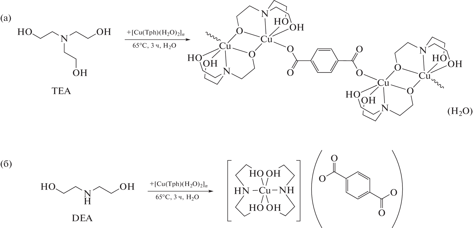 The reactions of Cu(II), Co(II), and Zn(II) terephthalates with hydroxyalkylamines (tris(2-hydroxyethyl)amine, bis(2-hydroxyethyl)amine, tris(hydroxymethyl)aminomethane, and bis(2-hydroxyethyl)aminotris(hydroxymethyl)methane) are studied for the first time. The structures and properties of the synthesized complexes are studied by IR spectroscopy, electronic absorption spectroscopy, mass spectrometry, and elemental and thermal analyses. The structure of the binuclear heteroligand [Cu2(TEA)2(Tph)]n·H2O complex is studied by single-crystal X-ray diffraction (XRD) (CIF file CCDC no. 2224437).