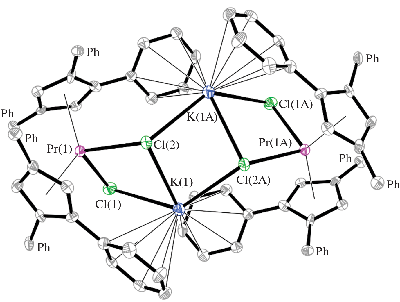 Взаимодействие трифенилциклопентадиенилкалия с тетрагидрофуранатами хлоридов празеодима и эрбия, в зависимости от соотношения реагентов, приводит к образованию тетраядерных ат-комплексов [{(Ph3C5H2)Pr(THF)}2(µ2-Cl)2(µ3-Cl)3K]2(C7H8)4 (I) и [{(Ph3C5H2)Er(THF)}2(µ2-Cl)2(µ3-Cl)3K(THF)]2 (III); и биядерных ат-комплексов [(Ph3C5H2)2LnCl(KCl)]2 Ln = Pr (II), Er (IV) (CCDC № 2224244 (I), 2224243 (II), 2224245 (III), 2224242 (IV)). В основе сходных по строению комплексов I и III лежит остов {[Ln2(µ-Cl)3]2(µ-Cl)2K2}, в III катион калия дополнительно координирован молекулой ТГФ. В основе строения изоструктурных II и IV биядерный остов [Ln(µ-Cl)2K]2.