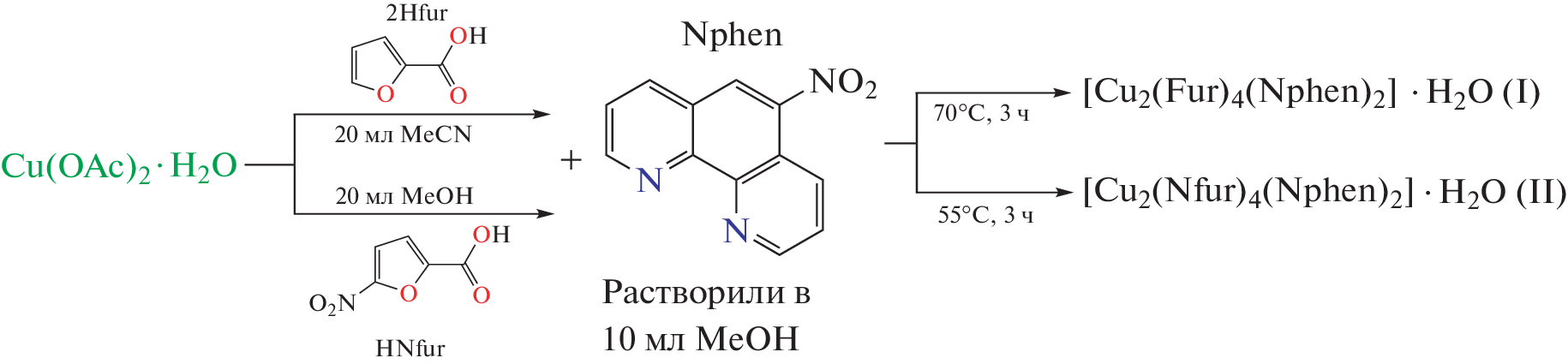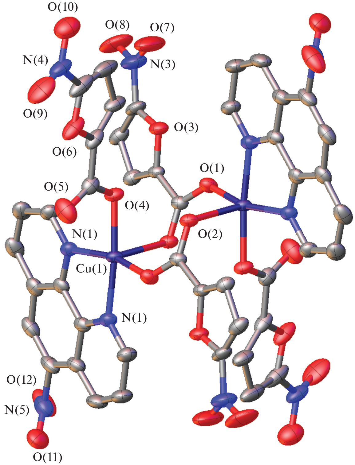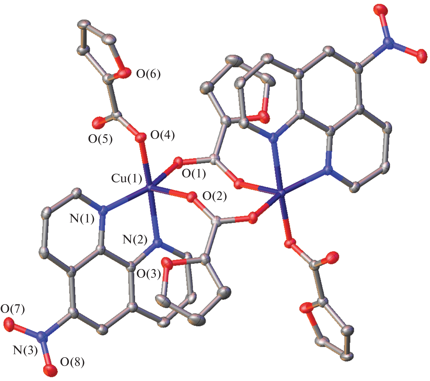 The reaction of copper(II) acetate with 2-furancarboxylic (HFur)/5-nitro-2-furancarboxylic (HNfur) acids and 5-nitro-1,10-phenanthroline (Nphen) in methanol resulted in the formation of the binuclear coordination compounds [Cu2(L)4(Nphen)2]·X (L = Fur (I), Nfur (II); X = H2O (I)), which were structurally studied by direct X-ray diffraction (CCDC no. 2244205 (I) and 2244206 (II)). According to X-ray diffraction data, the coordination environment of the central metal ion in I and II is composed of two nitrogen atoms of Nphen and three oxygen atoms of the acid anions, which thus form the {CuN2O3} tetragonal pyramid in which the copper coordination number is five. Intermolecular hydrogen bonds and stacking interactions between the Nphen aromatic rings provide supramolecular stabilization of I and II. A characteristic feature of supramolecular organization of II is the presence of a coordination bond between the Cu2+ cation and oxygen of the Nphen NO2- group of parallel chains. A biological activity assay for complexes I and II concerning the cytotoxic properties against a human ovarian adenocarcinoma cell line (SKOV3) and the mycobacterial strain Mycolicibacterium smegmatis showed an efficient suppression of cell viability. The results of mathematical modeling of the probability of Cu2+ binding to amino acid residues of M. smegmatis proteins suggested the affinity of the Cu(II) ion to a number of amino acids in polypeptide sites. It was shown that metal ion binding in mycobacterial proteins is more characteristic of histidine- and glutamic acid-containing moieties.