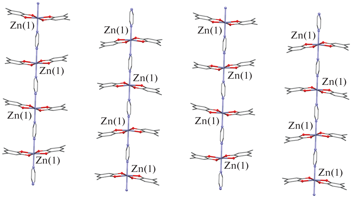 Получены новые бис-о-семихинолятные комплексы цинка на основе 3,5-ди-трет-октил-о-бензохинона, содержащие координированный на металл N-донорный лиганд – пиразин. В зависимости от метода синтеза бирадикального производного цинка могут быть получены два различных продукта: координационный полимер (прямое окисление металлического цинка о-хиноном (CCDC № 2250574 (I)) или полиядерный кластер (обменная реакция (CCDC № 2250575 (II)). Координационный полимер имеет линейное строение и свободен от межмолекулярных π,π-взаимодействий между ароматическими фрагментами соседних молекул. Магнетохимическое исследование комплексов I и II показывает, что доминирующими являются внутримолекулярные антиферромагнитные обменные взаимодействия между спинами о-семихинолятных радикальных центров.