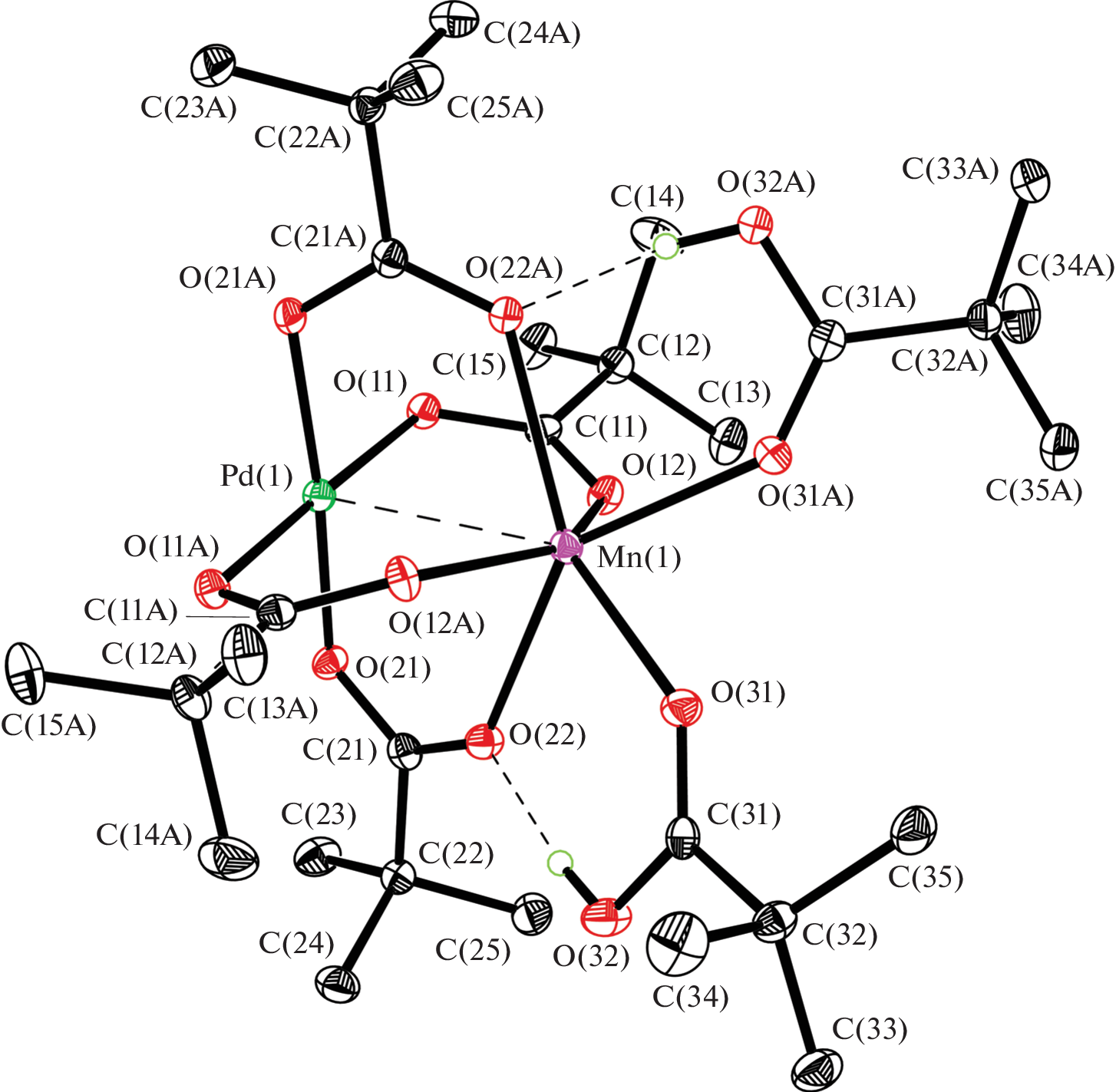 A number of new bimetallic acetate and pivalate complexes of the Pd–Mn system have been synthesized and structurally characterized. The starting complex [Pd(OOCMe)4Mn] reacts with N donor ligands such as 1,10-phenanthroline to form [Pd(OOCMe)4Mn(phen)]·MeCN (I) (CIF file CCDC no. 2217716). The reactions of substitution of acetate bridges for pivalate bridges in heterometallic carboxylate Pd–Mn complexes have been studied; It has been shown that complete replacement of all acetate bridges with pivalate bridges is possible both in the heterometallic complex (I), in which there is a ligand coordinated to an additional metal atom, with the formation of the compound [Pd(Piv)4Mn(phen)]·C6H6, (II) ( CIF file CCDC No. 2217717), structurally close to the original acetate complex, and in the acetate complex [Pd(OOCMe)4Mn]. The heterometallic pivalate cocrystallizate [Pd(Piv)4Mn 2HPiv] (III) obtained in the latter case (CIF file CCDC No. 2217718) is capable of reacting with 5-nitro-1,10-phenanthroline to form the complex [Pd(Piv)4Mn( nphen)] (IV) (CIF file CCDC No. 2217719).