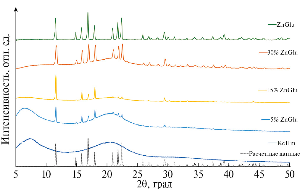 Рис. 1. Данные порошковой рентгеновской дифракции для образцов ZnGlu и композитных пленок на его основе, добавленного в количествах 5, 15 и 30% общей массы гидроколлоидов, в сравнении с теоретически рассчитанной дифрактограммой ZnGlu.