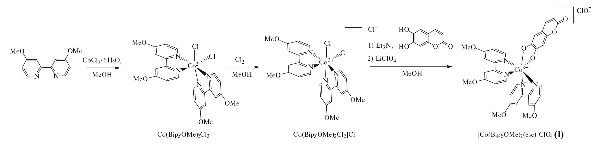 Синтез комплекса [Co(BipyОМе)2(esc)]ClO4 (I). Раствор 6,7-дигидроксикумарина (0.5 ммоль, 89 мг) и триэтиламина (1 ммоль, 10.2 мг, 139 мкл) в 10 мл метанола добавляли к раствору [Co(BipyОМе)2Cl2]Cl (0.5 ммоль, 299 мг) в 15 мл метанола. Полученную смесь кипятили в течение 3 ч, затем охлаждали до комнатной температуры, добавляли раствор перхлората лития (1.25 ммоль, 133 мг) в 5 мл метанола и перемешивали 30 мин при охлаждении на водяной бане для кристаллизации целевого комплекса. Образовавшийся зеленый осадок отделяли фильтрованием, промывали изопропанолом, диэтиловым эфиром и высушивали при пониженном давлении. Выход — 249 мг (65%).