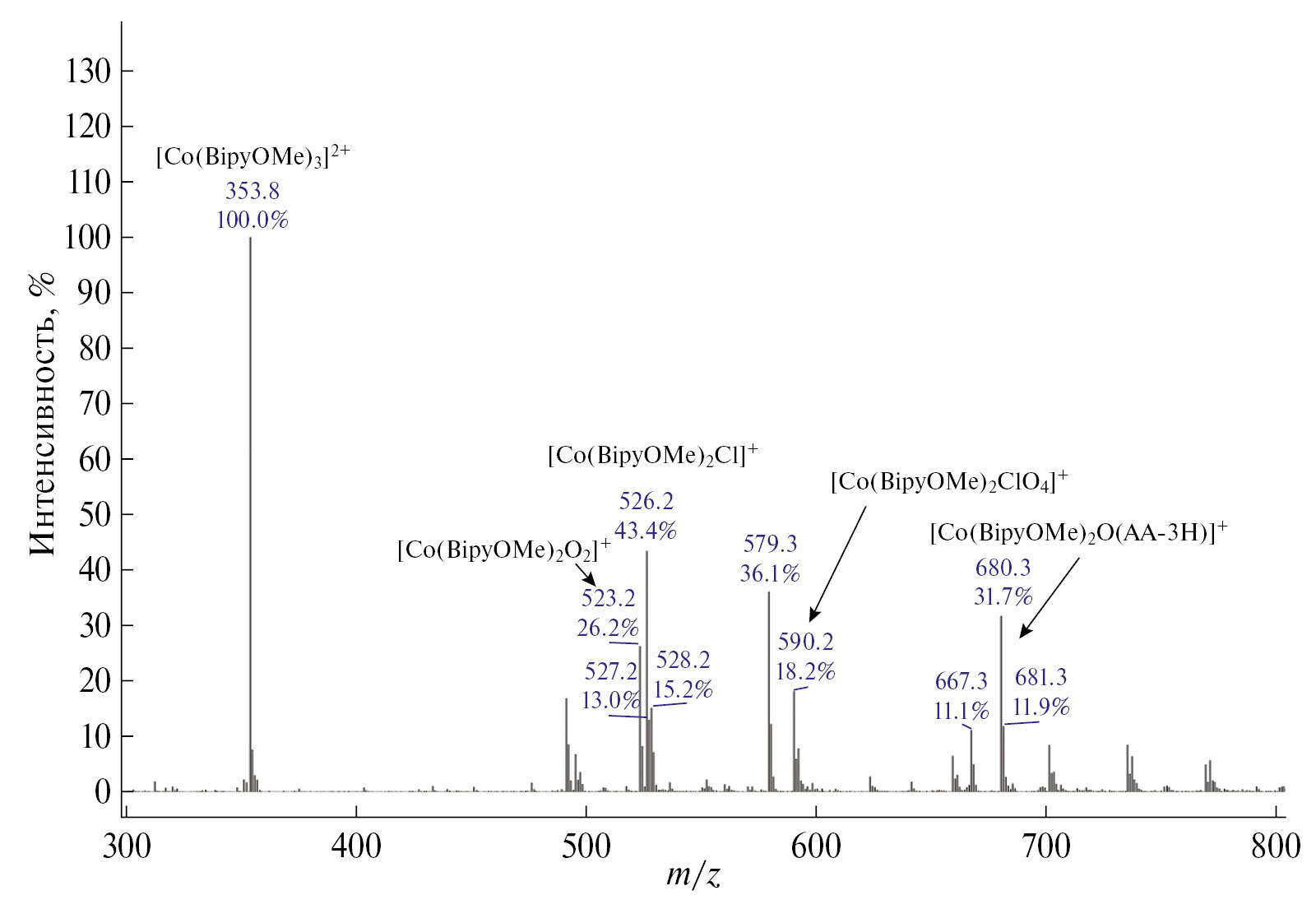 На рис. 4 приведены спектры ЯМР 1Н, иллюстрирующие динамику процесса восстановления комплекса I аскорбиновой кислотой. В спектрах можно выделить диамагнитную (от 0 до 10 м.д.) и парамагнитную (от 15 до 120 м.д.) области. Первая содержит сигналы исходного комплекса, аскорбиновой кислоты, продукта ее окисления и свободного 6,7-дигидроксикумарина, а вторая — сигналы образующихся комплексов кобальта(II). По мере протекания реакции интенсивность сигналов в диамагнитной области уменьшается, а в парамагнитной, наоборот, увеличивается. Видно, что реакция протекает достаточно медленно, так как интенсивные сигналы в парамагнитной области появляются только спустя 5 сут. Число сигналов в парамагнитной области, их химический сдвиг и интегральная интенсивность соответствуют комплексу [Co(BipyOMe)3]2+, что дополнительно подтверждается масс-спектрометрическим анализом продуктов восстановления. Масс-спектр реакционной смеси, изображенный на рис. 5, содержит интенсивные сигналы с m/z 353.8, 590.2 и 526.2, относящиеся к ионам [Co(BipyOMe)3]2+, [Co(BipyOMe)2(ClO4)]+ и [Co(BipyOMe)2Cl]+. Появление в масс-спектре аддуктов с хлорид-анионом может быть связано с неполной заменой хлорид-иона на перхлорат при синтезе I из [Co(BipyOMe)2Cl2]Cl. Также в масс-спектре реакционной смеси, зарегистрированном для положительных ионов, наблюдается сигнал с m/z 680.3, который предположительно можно отнести к комплексу кобальта(II) с окисленной формой аскорбиновой кислоты в качестве одного из лигандов (рис. 5). Таким образом, восстановление комплекса кобальта(III) [Co(BipyOMe)2(esc)]ClO4 протекает с образованием комплекса кобальта(II) [Co(BipyOMe)3](ClO4)2 и сопровождается высвобождением молекулы 6,7-дигидроксикумарина. Аналогичный механизм восстановления наблюдался для комплексов кобальта(III) с 6,7-дигидроксикумарином, содержащих бипиридин или фенантролин вместо 4,4ʹ-диметоки-2,2ʹ-бипиридинового лиганда.