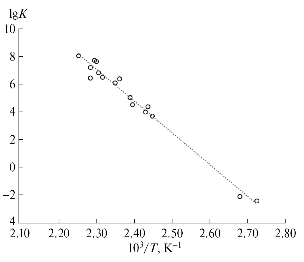 Рис. 2. Температурная зависимость масс-спектральной константы равновесия реакции (5).