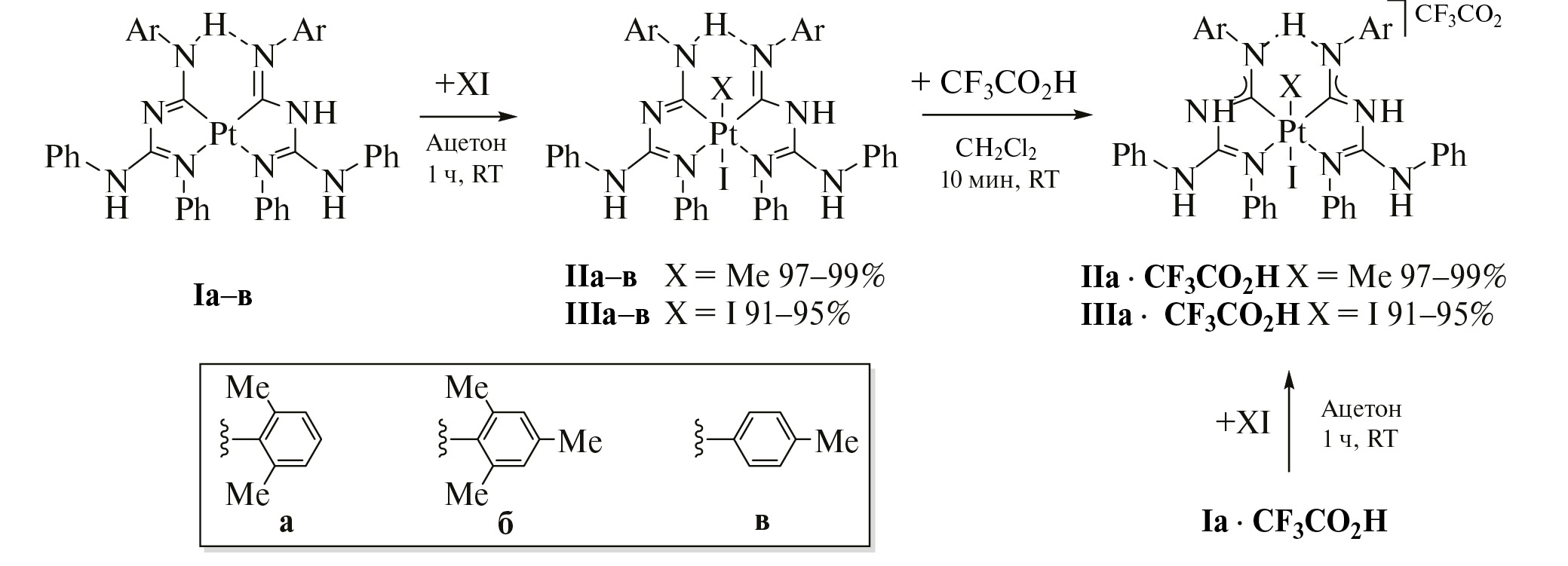Добавление CF3CO2H к IIа или IIIа приводит к образованию катионных комплексов IIа ∙ CF3CO2H и IIIа ∙ CF3CO2H. Соединения IIа ∙ CF3CO2H и IIIа ∙ CF3CO2H также могут быть получены присоединением метилиодида и молекулярного иода к катионному комплексу платины(II) Iа ∙ CF3CO2H (схема 1).