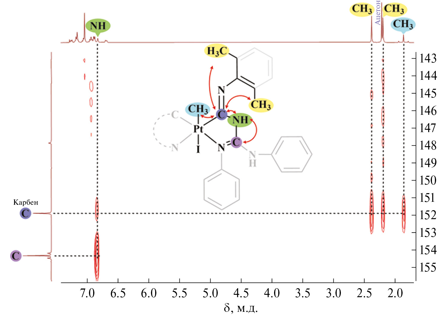 Соотнесения сигналов IIа ∙ CF3CO2H в спектрах ЯМР 1H и 13C{1H} произведено с помощью методов корреляционной 2D ЯМР-спектроскопии (1H,1Н-COSY, 1H,1Н-NOESY, 1H,13C-HSQC, 1H,13C-HMBC, 1H,15N-HSQC и 1H,15N-HMBC). Известно, что диаминокарбеновые атомы углерода резонируют при δC 160–224 м.д. [36]. В спектре ЯМР 13C{1H} IIа ∙ CF3CO2H наблюдается сигнал δC 151.87 м.д., большое значение JC,Pt = = 1014 Гц сателлитного дублета указывает на прямую координацию этого атома углерода к платине [37, 38]. К тому же в спектре 1H,13C-HMBC IIа ∙ CF3CO2H сигнал δC 151.87 м.д имеет кросс-пик с протонами координированного к платине(IV) метильного заместителя (δH 1.84 м.д.) (рис. 1). Это позволяет утверждать, что сигнал δC 151.87 м.д. в IIа ∙ CF3CO2H принадлежит диаминокарбеновому атому углерода. В спектре ЯМР 13C{1H} IIа наблюдается два сигнала с большими значениями JC,Pt при δC 144.25 и 167.40 м.д. (JC,Pt 1045.2 и 925.1 Гц соответственно), относящиеся к карбеновым атомам углерода. По сравнению с Iа–в [19, 20] сигналы карбеновых атомов углерода в IIа–в и IIIа–в смещены в область низких частот на 20–30 м.д. Ранее подобные низкочастотные сдвиги δC карбеновых атомов углерода наблюдали в спектрах бис-(C,N-хелатных) NHC комплексов платины при переходе от степени окисления +2 к +4 [39].