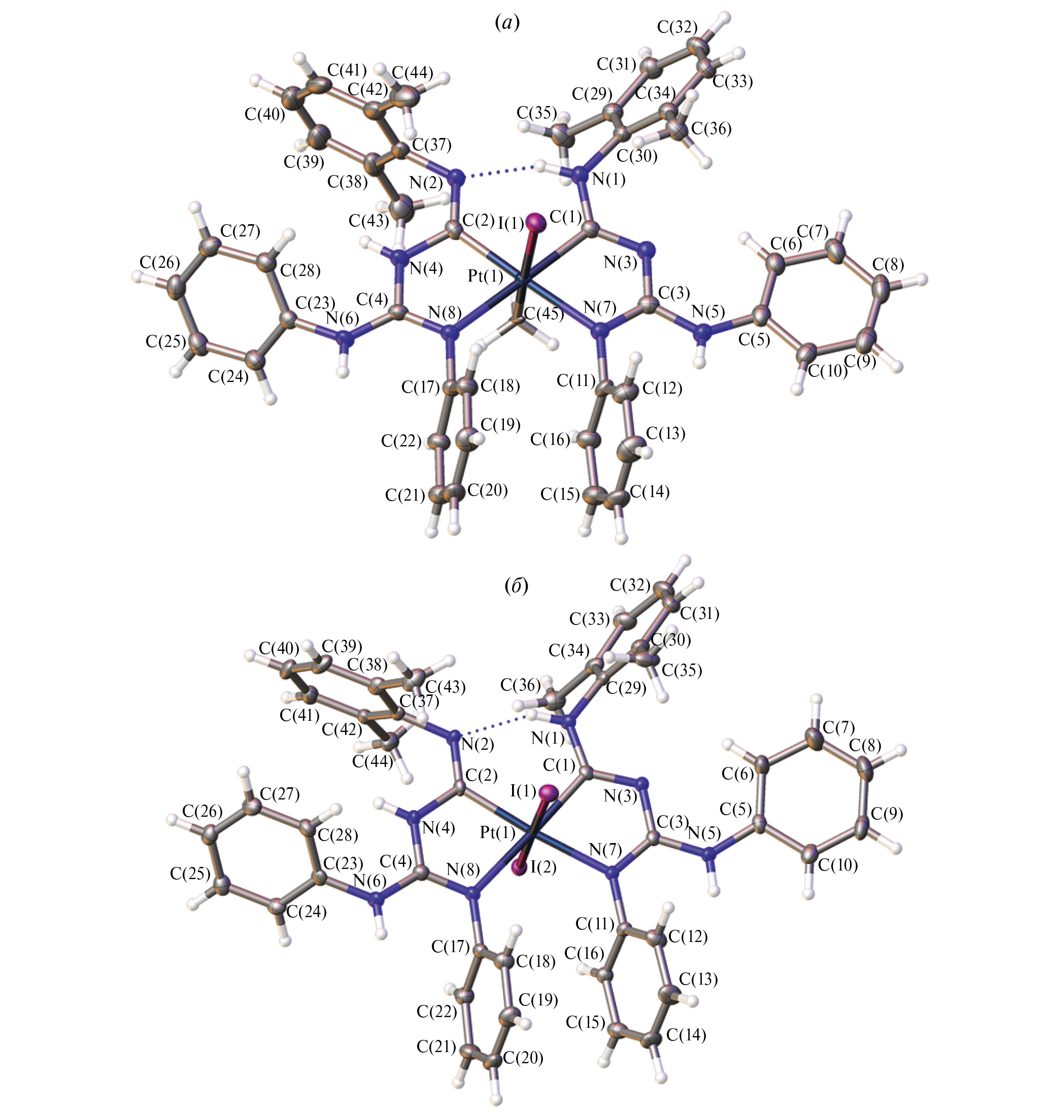 По результатам РСА, IIа–в и IIIа–в являются электронейтральными молекулами. Октаэдрическая координационная сфера образована двумя депротонированными диаминокарбеновыми C,N-хелатными заместителями, а также иодом и метилом (IIа–в) или двумя атомами иода (IIIа–в), расположенными в апикальных положениях. Расстояния Pt–Cкарбен (1.996(6)–2.030(3) Å) и Pt–N (2.105(3)–2.157(2) Å) в IIа–в, IIIа–в больше, чем в Iа–б (Pt–Cкарбен, 1.964(2)–1.981(6) Å, Pt–N, 2.0925(18)–2.121(5) Å) [19, 20] и меньше, чем в известных NHC комплексах платины(IV) (2.015–2.079 Å) [13, 35]. Углы NCкарбенN (120.1(6)°–123.9(5)°) в IIа–в, IIIа–в несущественно больше, чем в Iа–б (116.9(2)°–119.7(5)°) [19, 20]. Значения параметров длин C–N связей и углов NCкарбенN входят в характерный диапазон для диаминокарбеновых комплексов [15, 36]. Углы между хелатной плоскостью и I или Me в IIа–в, IIIа–в близки к прямым (84.75(13)–95.06(9) Å), а расстояния Pt–I и Pt–Me в IIа–в, IIIа–в (2.6472(2)–2.7661(2) и 2.119(3)–2.170(4) Å соответственно) схожи с метилированными комплексами платины(IV) [13, 28, 29, 35, 49]. Связь Pt–Cкарбен на 0.128–0.140 Å короче Pt–Me, что связано с частично двойным характером связи металл–карбен [50]. Связь Pt–I длиннее в IIа–в, чем в IIIа–в из-за большего транс-влияния углерода метильной группы по сравнению с иодидным лигандом [28]. В IIIа–в длины связей Pt–I (2.6472(2)–2.6598(3) Å) сопоставимы с другими комплексами Pt(IV) с транс-иодидной геометрией [28].
