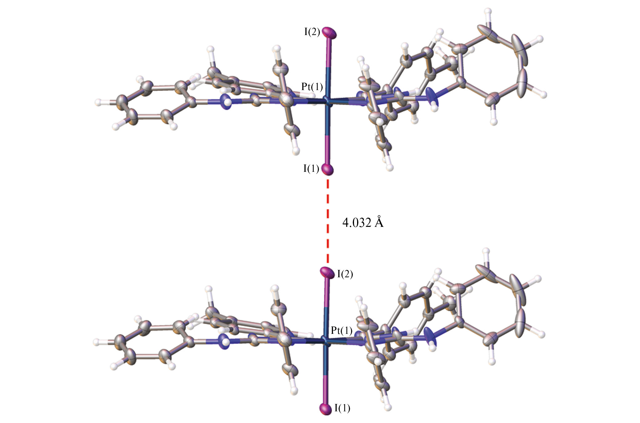 В структуре IIIв обнаружен короткий межмолекулярный контакт между иодидными заместителями (рис. 3). Расстояние I(1) ∙∙∙ I(2) 4.032(3) Å сопоставимо с уволенным ван-дер-ваальсовым радиусом атома иода, предложенным Бонди (101.8% от суммы) [51]. Близкие значения углов Pt(1)I(1)I(2) и Pt(1)I(2)I(1) (176.5°–178.1°) позволяют предположить, что данный контакт относится к неполярным контактам галоген–галоген I типа [52].