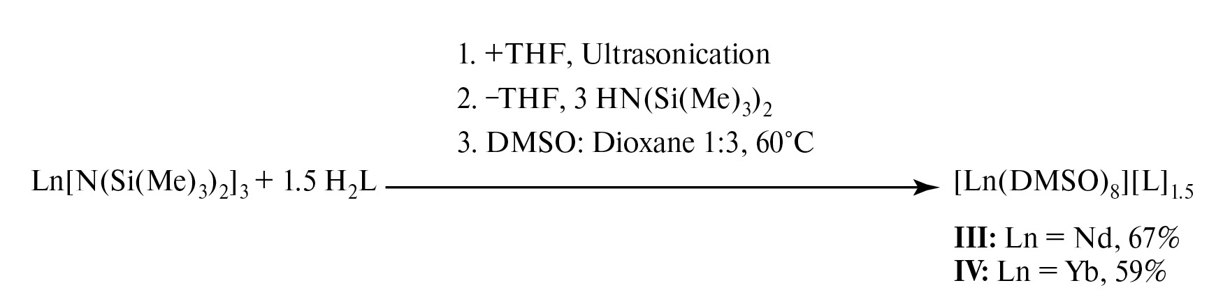 Для синтеза лантаноидсодержащих КП на основе дитопного бисмеркаптооксазола H₂L были проведены реакции силиламидных комплексов неодима и иттербия Ln[N(Si(Me)3)2]3 со свободным бистиазолом в три стадии в соответствии со схемой 3. После нагревания в течение 2 сут при температуре 60oC в реакции с неодимом были обнаружены светло-голубые кристаллы соединения III, которые, по данным РСА, представляют собой ионный комплекс [Nd(DMSO)8][L]1.5.