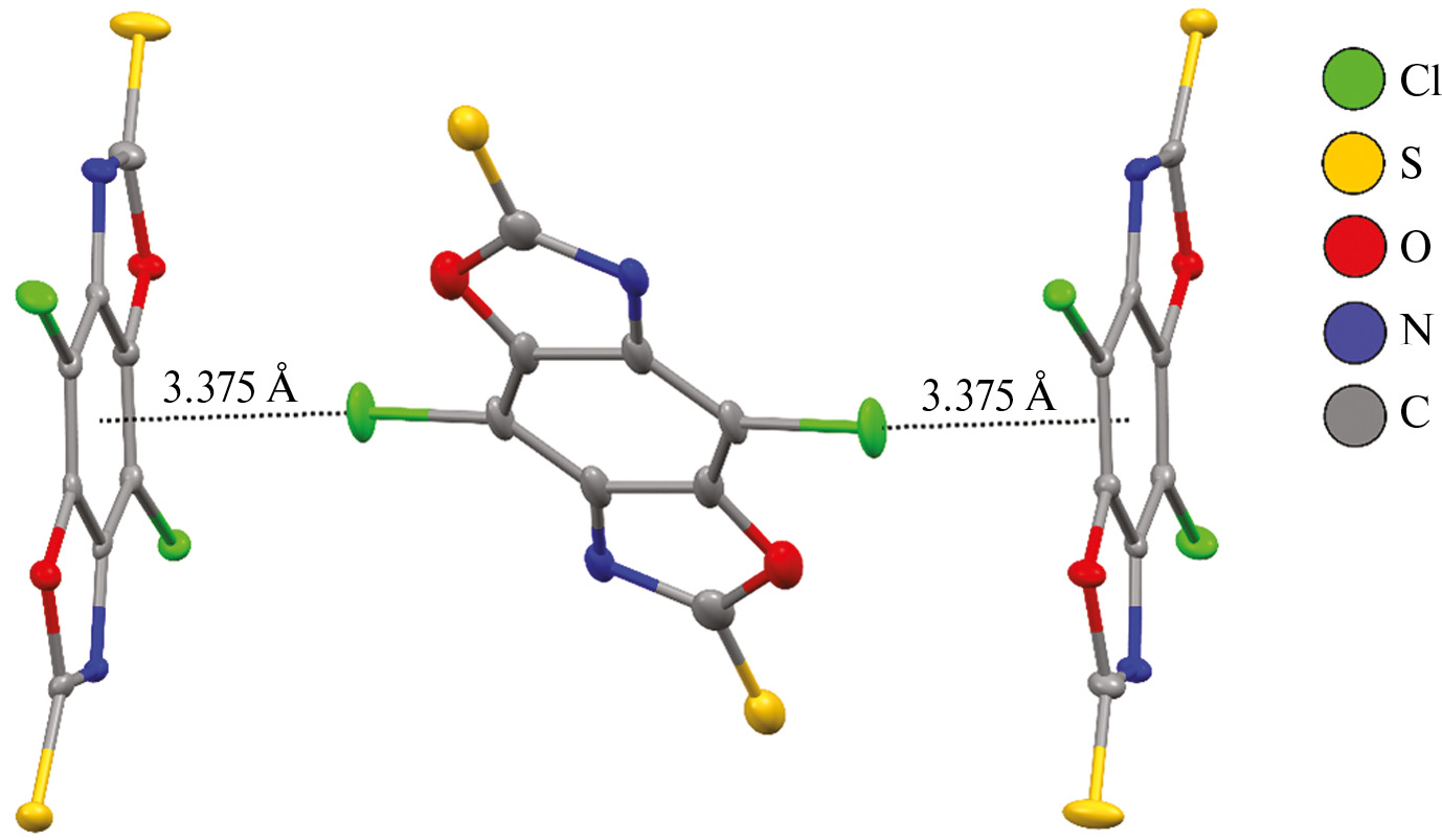 В кристаллической упаковке молекулы бисмеркаптооксазола формируют одномерные стопки (рис. 2). Двугранные углы между плоскостями соседних H₂L составляют 0o и 8.8o, а расстояния между центрами ароматического кольца одной молекулы и центром связи C=S другой состаляют 3.73 и 3.55 Å соответственно. Такие геометрические характеристики свидетельствуют о реализации в кристалле межмолекулярного π…π-взаимодействия [36].