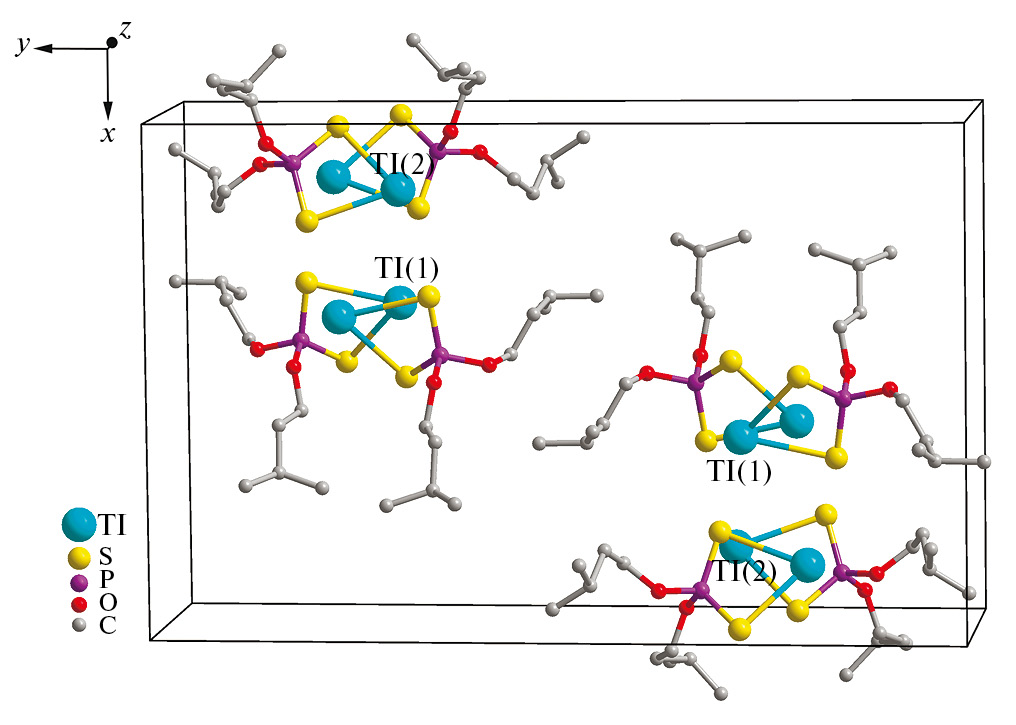 В каждом из неэквивалентных лигандов Dtph атом фосфора находится в искаженно тетраэдрическом окружении [S2O2]. Как и ожидалось из данных ИК-спектроскопии, длина связей P–S лежит в узком диапазоне 1.966(2)–1.985(6) Å, что указывает на их эффективное усреднение в результате связывания лигандов Dtph таллием за счет высокой степени делокализации p-электронной плотности внутри образующихся малоразмерных металлоциклов [TlS2P]. Длина связей C–C в алкильных заместителях лигандов Dtph в составе молекул A/B: 1.33(3), 1.48(3), 1.496(18)–1.576(18), 1.68(3)/1.455(12)–1.570(16) Å (без минорной компоненты разупорядочения).