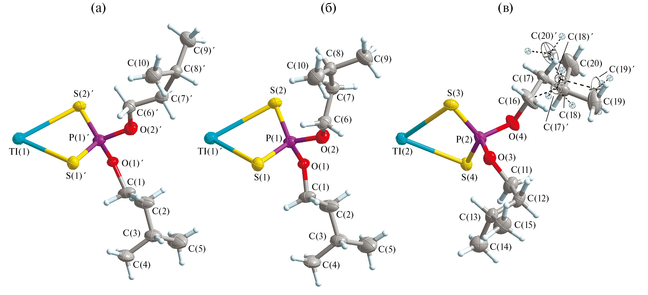 В состав элементарной ячейки комплекса I входит восемь формульных единиц [Tl{S2P(O-изо-C5H11)2}] (табл. 1, рис. 1). Молекулы, включающие атомы Tl(1) и Tl(2), структурно неэквивалентны (далее молекулы А и В соответственно). При этом в молекуле А большинство атомов, кроме С(1)–С(5) и С(10), разупорядочены между двумя структурными положениями с одинаковой заселенностью (рис. 2а, 2б). В молекуле В эффект структурного разупорядочения проявляется только для части атомов углерода, С(17)–С(20), в одной из цепей алкильных заместителей (рис. 2в). В обсуждаемых молекулах лиганды Dtph координированы таллием S,S´-анизобидентатно, длина связей Tl–S лежит в диапазоне 3.006(2)–3.092(4) Å c образованием четырехчленных металлоциклов [TlS2P], хотя различие в длине связей Tl–S внутри каждого из циклов относительно невелико (0.018–0.057 Å). Необходимо отметить, что приведенные для связей Tl–S значения занимают промежуточное положение между длиной идеальной ковалентной связи (как суммы ковалентных радиусов атомов таллия и серы — 2.45 Å) и вторичной связи1 (как суммы их ван-дер-ваальсовых радиусов — 3.76 Å [25, 26]2), что может отражать пониженный вклад ковалентной составляющей в эти связи.