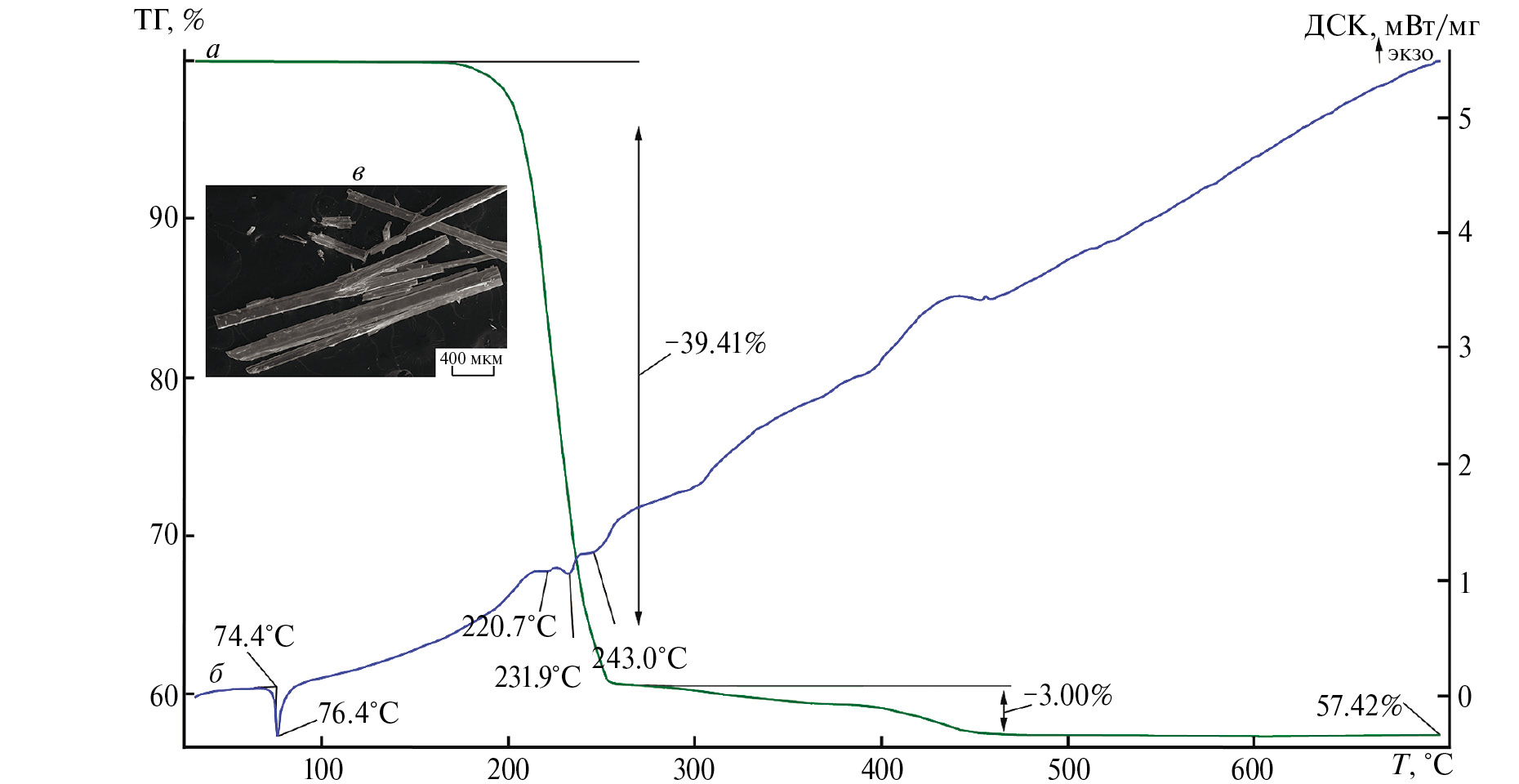 Рис. 5. Кривые ТГ (а) и ДСК (б); размер и форма кристаллов I (в)