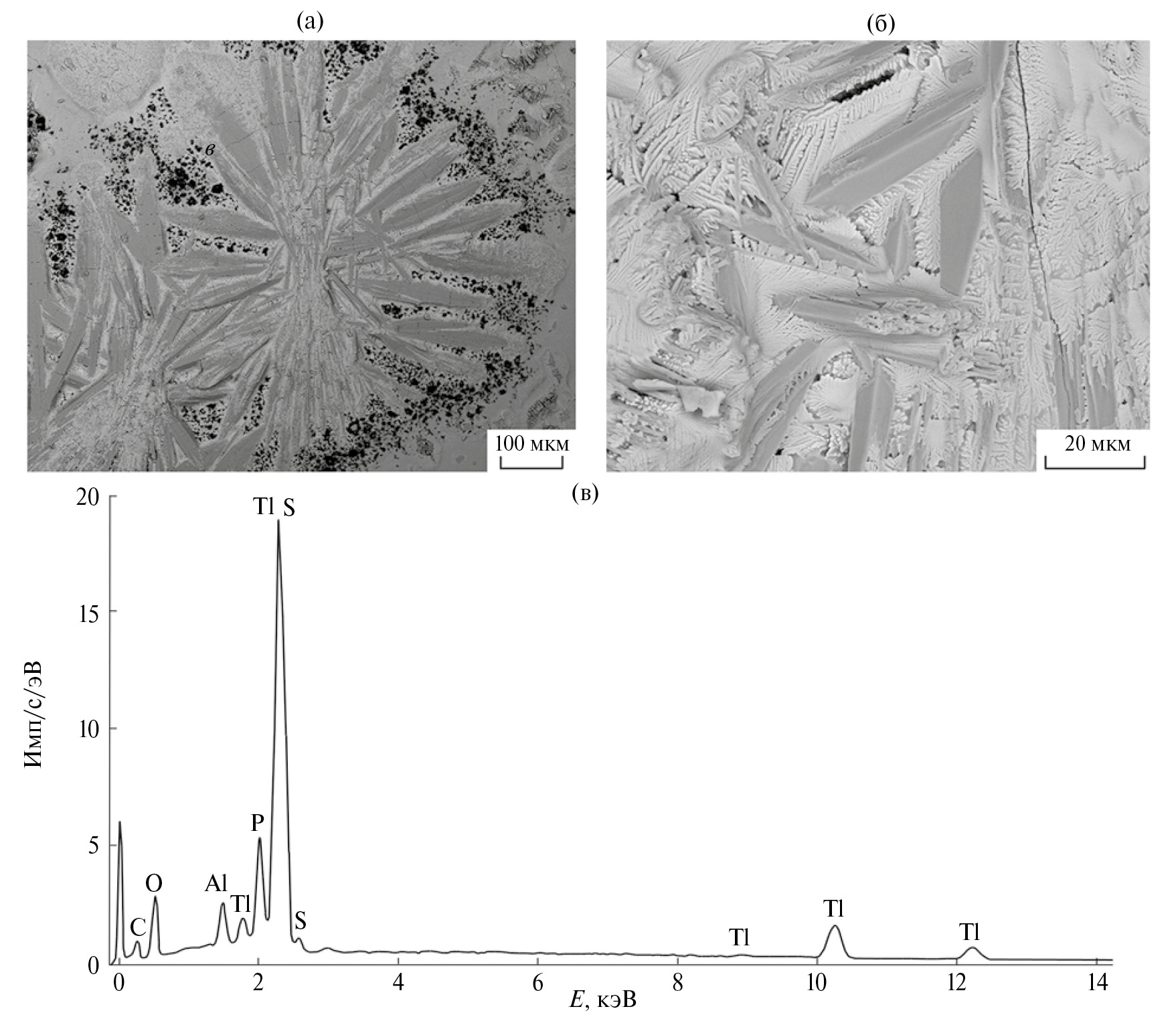 При вскрытии тигля, после остывания, на дне обнаружен темно-серый блестящий мелкокристаллический остаток, для исследования которого были использованы растровая электронная микроскопия и рентгеноспектральный микроанализ. На рис. 6а и 6б приведены укрупненный план дна тигля со сростками макроагрегатов остаточного вещества и размер, форма, микроструктура его частиц соответственно. Несмотря на очевидные морфологические и размерные различия между частицами исследуемого вещества (рис. 6б), использование метода рентгеноспектрального микроанализа не позволило выявить каких-либо вариаций в их химическом составе. Экспериментальные энергодисперсионные спектры практически идентичны (рис. 6в) и включают характеристические пики таллия, серы и фосфора. (Присутствие пика алюминия, вероятно, обусловлено тем, что исследование термического поведения I проводилось в корундовом тигле.)
