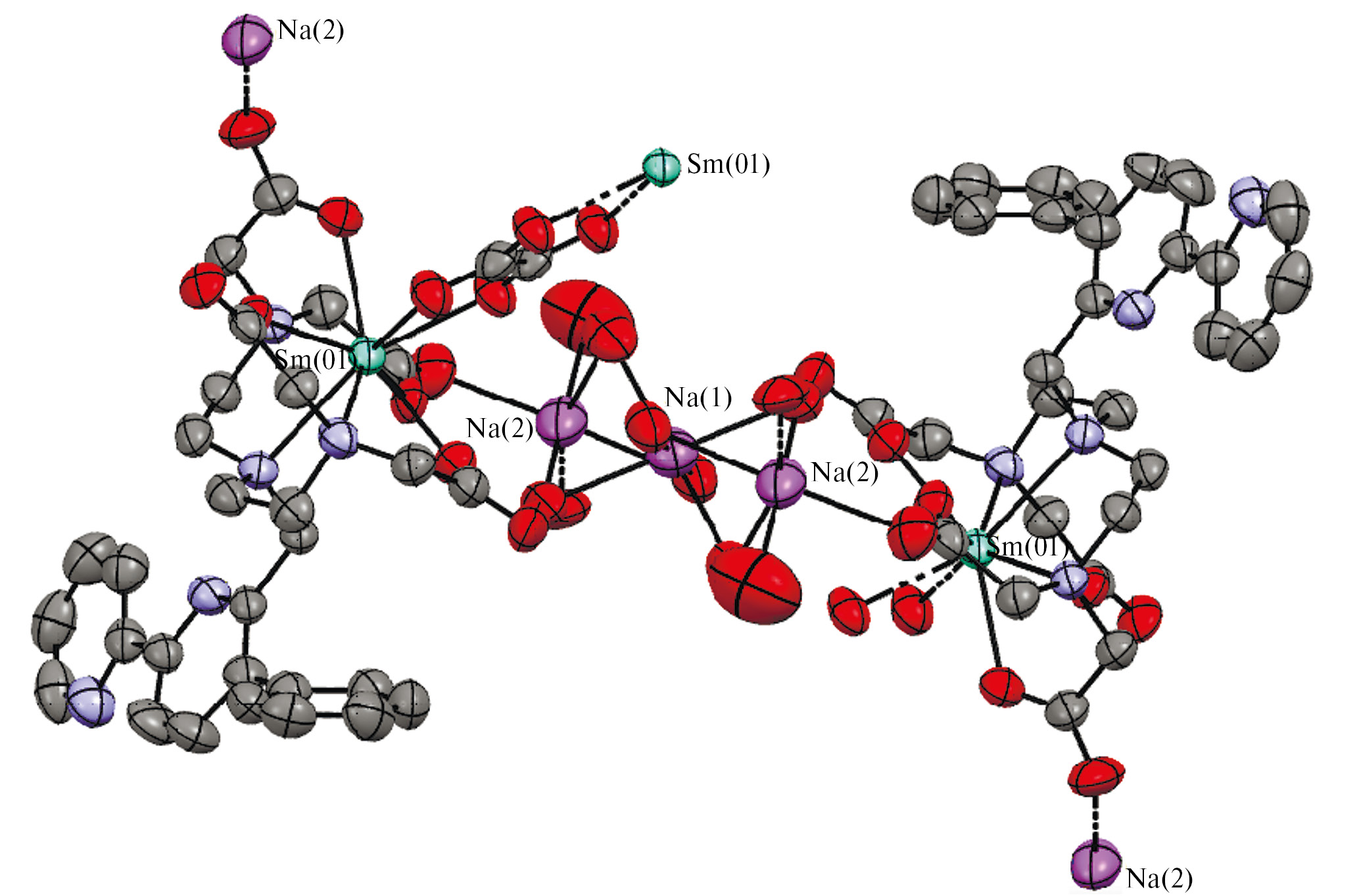 Основные кристаллографические параметры соединения I: кристалл C60H58N10Na5O20Sm2 • 9(H2O) [+ вода], моноклинный, пространственная группа P21/n, Z = 2, при 295 К; a = 18.6930(4); b = 9.9504(2); c = 24.1619(6) Å, β = 101.415(2)о, V = 4405.28(17) Å3, ρ(выч.) = 1.349 г/см3, μ = 1.410 мм–1. Диапазон съемки 2.3° < θ < 26.4°, измерено 638243 отражения, независимых 9013 (Rint = 0.283), из них наблюдаемых 7073 от ражения с I > 2σ(I). Окончательные значения факторов расходимости R1 = 0.0756, wR2 = = 0.1416 по наблюдаемым отражениям с I > 2σ(I), R1 = 0.0968, wR2 = 0.1505 по всем отражениям, фактор добротности GOOF = 1.13. Пики остаточной электронной плотности 1.87/–0.67 e Å3.