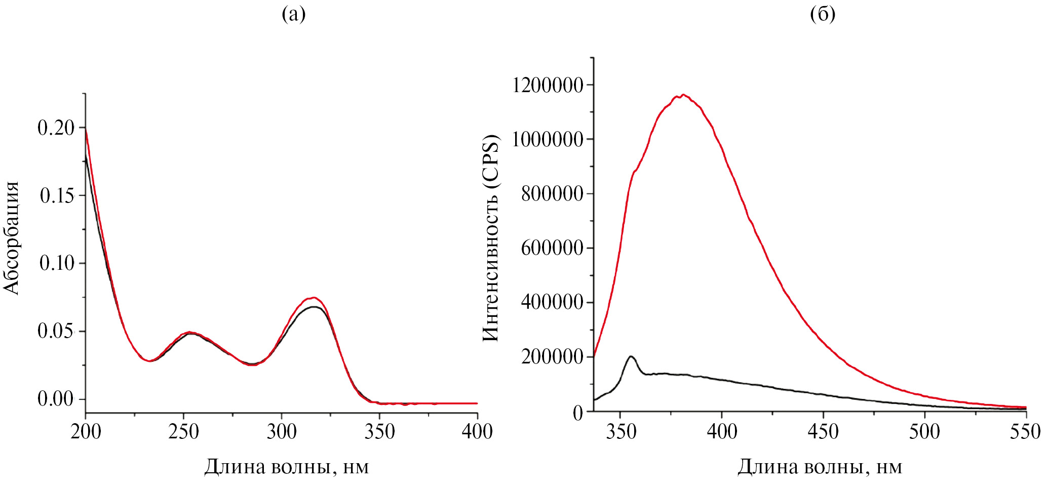 Рис. 5. Спектры поглощения (a) и испускания (б) комплекса I до (черные линии) и после (красные линии) добавления избытка катионов Zn2+ в воде при комнатной температуре.