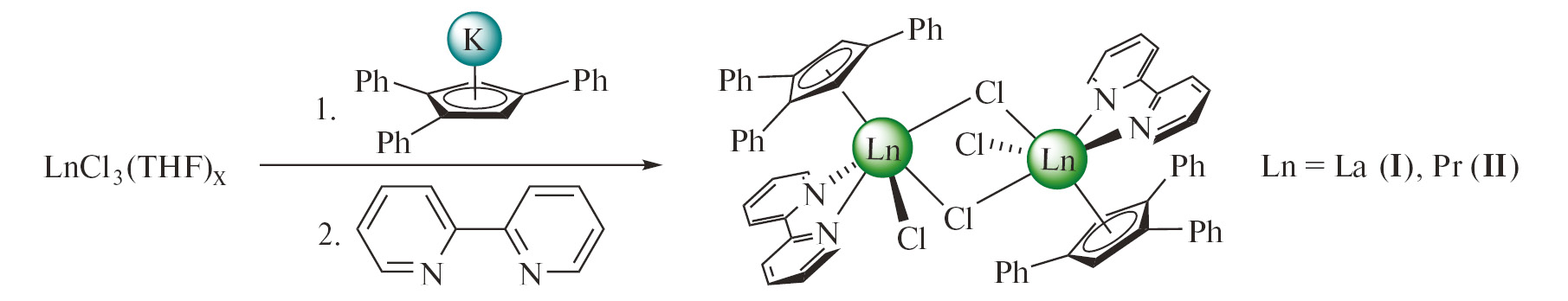 Интересно, что подобное лигандное окружение иона РЗЭ — трифенилциклопентадиенильный и бипиридиновый лиганды в сочетании с двумя хлоридными лигандами — приводит к весьма разнообразной геометрии координационной сферы металла и, как следствие, к широкому разнообразию структур комплексов, одинаковых с точки зрения набора лигандов. В случае лантана и празеодима образуются биядерные комплексы [CpPh3Ln(Bipy)Cl(μ2-Cl)]2 (Ln = La (I), Pr(II); схема 1). Комплексы I и II были получены перекристаллизацией из смесей ТГФ–гексан в соотношении 1 : 1 в виде оранжево-желтых (I) и желто-зеленых (II) кристаллов мало растворимых в THF и не растворимых в толуоле.