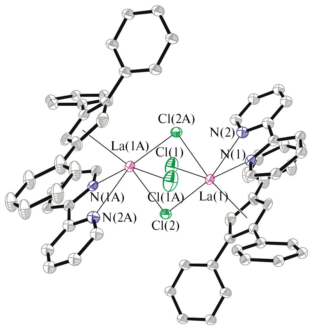 Синтез [CpPh3LaCl2(Вipy)]2 (I). Раствор бензилкалия (0.034 г, 0.26 ммоль) в 5 мл ТГФ медленно при перемешивании добавляли к 10 мл раствора CpPh3H в ТГФ (0.074 г, 0.25 ммоль). Реакционную смесь перемешивали в течение 15 мин, полученный раствор 1,2,4-трифенилциклопентадиенилкалия медленно прибавляли к перемешиваемой суспензии LaCl3(THF)2 (0.097 г, 0.25 ммоль) в 15 мл ТГФ. Реакционную смесь перемешивали 12 ч, затем прибавляли раствор Вipy (0.039 г, 0.25 ммоль) в 2 мл ТГФ. Реакционную смесь перемешивали 12 ч, выпавший осадок отделяли центрифугированием (4000 об/мин, 10 мин). Осадок экстрагировали ТГФ (2 × 5 мл ТГФ) для растворения остатка комплекса и снова центрифугировали. К объединенному раствору аккуратно добавляли 40 мл гексана, избегая смешения слоев. Через 3 сут образовались кристаллы комплекса I. Кристаллы сушили в динамическом вакууме. Выход I 0.098 г (0.074 ммоль, 59%) в виде оранжевого кристаллического порошка.