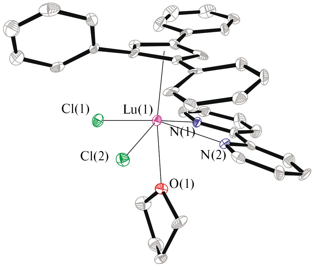 Синтез [CpPh3LuCl2(Bipy)(THF)] (IV) выполняли по описанной выше для I методике исходя из 0.034 г (0.26 ммоль) PhCH2K, 0.074 г (0.25 ммоль) CpPh3H, 0.124 г (0.25 ммоль) LuCl3(THF)3 и 0.039 г (0.25 ммоль) Bipy; полученный при центрифугировании реакционной смеси осадок экстрагировали 4 × 15 мл ТГФ. Выход IV 0.078 г (0.102 ммоль, 41%) в виде оранжевого кристаллического порошка.