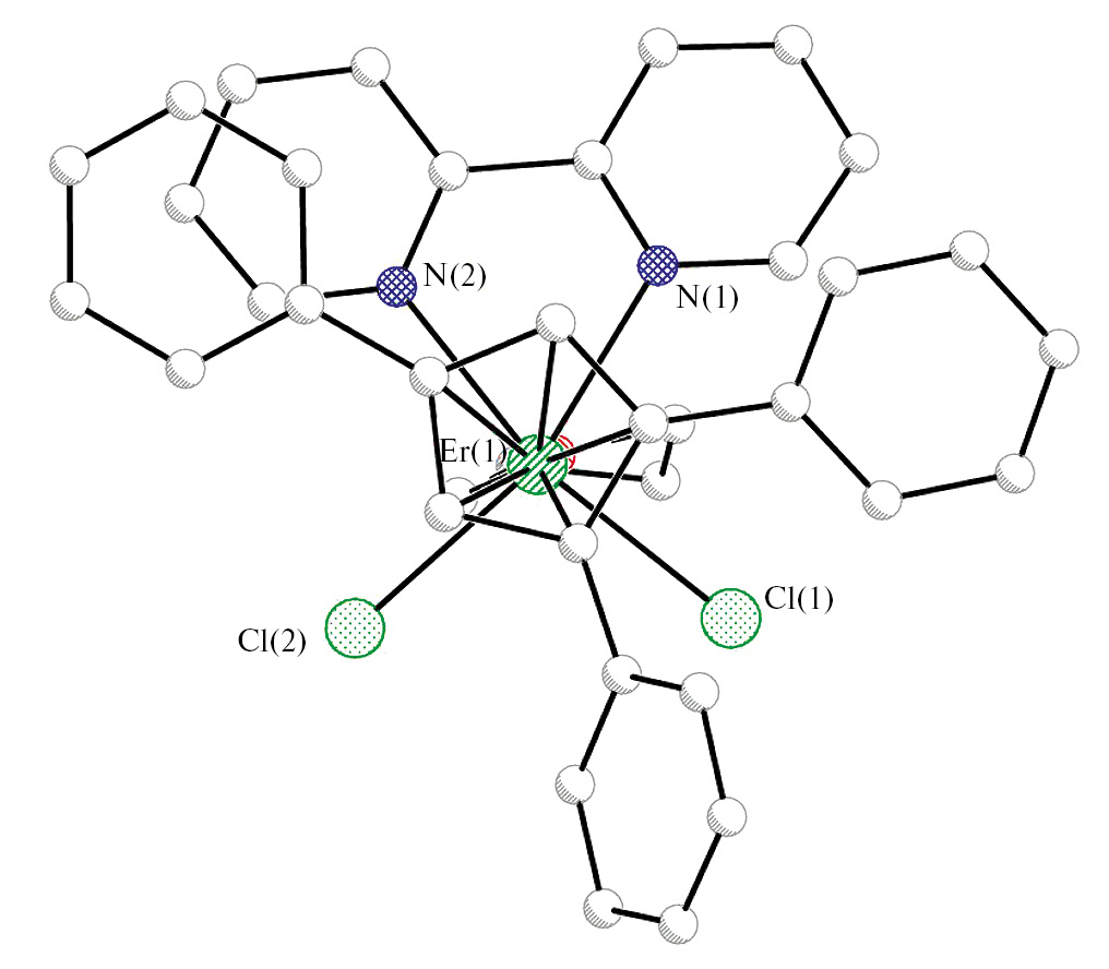 Аналогичные реакции тетрагидрофуранатов эрбия, лютеция и скандия с трифенилциклопентадиенилкалием и бипиридином приводят к образованию моноядерных комплексов [CpPh3Ln(Вipy)Cl2(THF)] (Ln = Er, (III) Lu (IV)), [CpPh3Sc(Вipy)Cl2] (V) (схема 2).