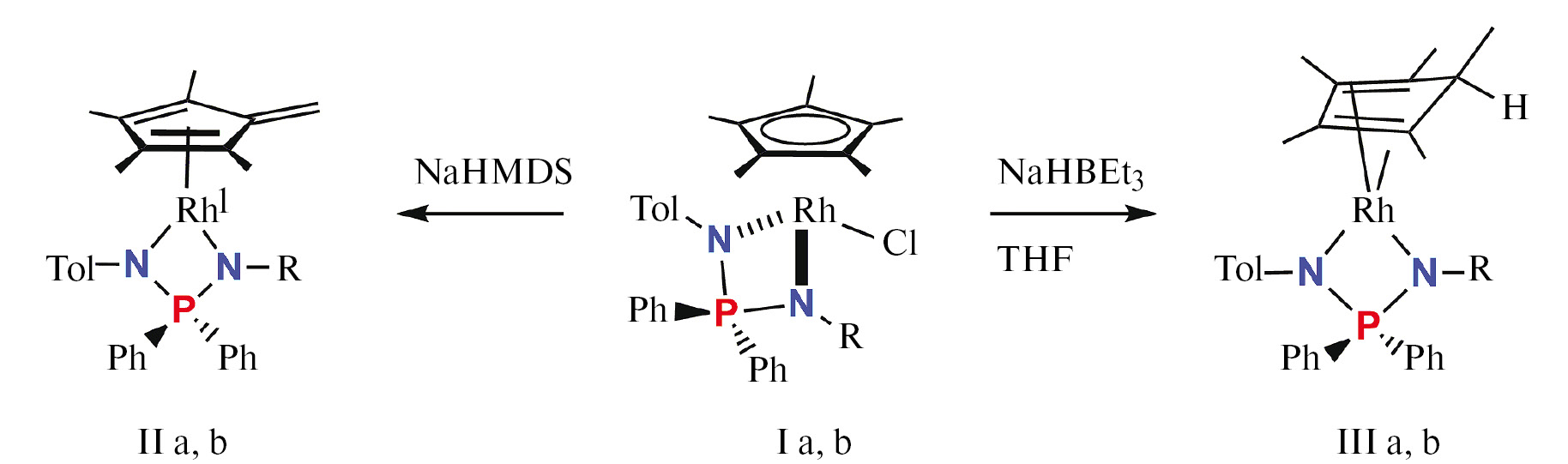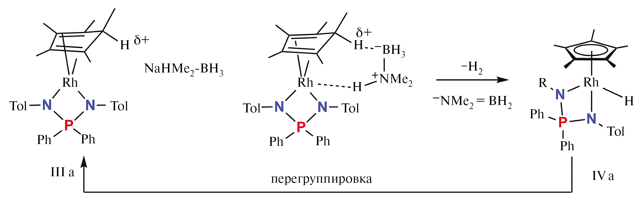 В недавнем исследовании Nozaki была показана активность бипиридильных комплексов [Cp*Rh(Bipy)(THF)](OTf)2 в каталитическом дегидрировании ДМАБ и высказано предположение об участии гидридных Cp*Rh(III)H и η4-циклопентадиеновых комплексов родия(I) в качестве интермедиатов каталитического цикла [20]. Недавно нами было показано, что взаимодействие иминофосфонамидных комплексов родия(III) [Cp*RhCl{Ph2P(N–p-Tol)(NR)}] (Iа, Ib) с основанием в изопропаноле не приводит к ожидаемым гидридным комплексам [Cp*RhH{Ph2P(N–p-Tol)(NR)}] (IVа, R = p-Tol; IVb, R = Me), а дает фульвеновые комплексы [(η4-С5Me4CH2)Rh{Ph2P(N–p-Tol)(NR)}] (IIа, IIb) [18]. Мы предприняли попытку синтеза гидридов Rh(III) IVа, IVb с использованием NaHBEt3, которые в условиях синтеза дают продукт перегруппировки IIIa, IIIb, и протестировали полученные комплексы III, а также комплексы I, II в дегидрировании ДМАБ.