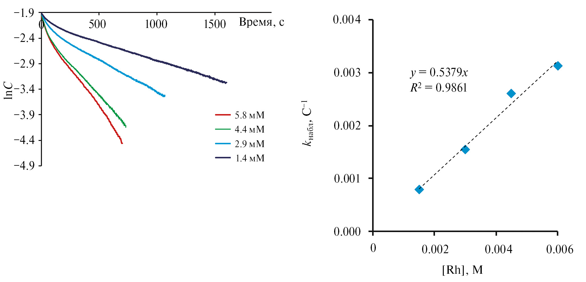 Рис. 3. Дегидрирование ДМАБ (0.145 М), катализируемое комплексом IIIb при 40°С в толуоле в зависимости от концентрации катализатора: кинетические кривые первого порядка (слева) и зависимость kнабл от [Rh].