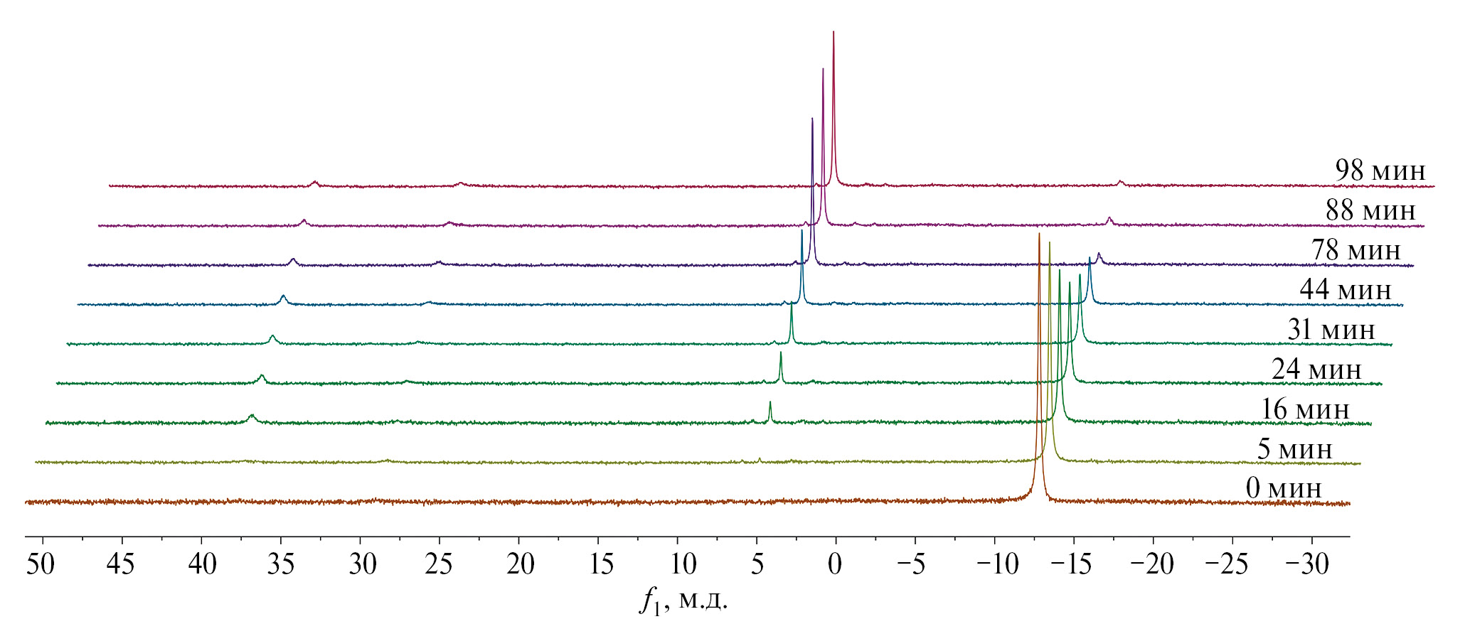Предварительное исследование эволюции комплекса IIIа в процессе катализа методом ЯМР в толуоле-d8, к сожалению, не дало возможности зафиксировать интермедиаты. Сразу же после добавления ДМАБ к раствору катализатора сигнал IIIа исчезает, и никаких новых сигналов не появляется, что, по-видимому, свидетельствует о быстрых для метода ЯМР превращениях промежуточно образующихся комплексов. После окончания катализа в спектре ЯМР 31Р наблюдаются только два сигнала, относящихся к исходному комплексу IIIа (дублет при δP = 40.4 м.д.) и новому неидентифицированному комплексу с сигналом при δP = 37.7 м.д.