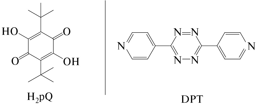 Редокс-активные координационные полимеры вынесены в отдельный подкласс МОКП [24, 32]. Одними из популярных лигандов, применяемых для создания редокс-активных систем, являются лиганды анилатного типа — производные 2,5-ди-гидрокси-пара-бензохинона с различными заместителями в положениях 3 и 6 хинонового фрагмента [3, 33, 34]. Применение 2,5-ди-гидрокси-3,6-ди-трет-бутил-пара-бензохинона (H2pQ) (схема 1) для построения координационных полимеров началось несколько лет назад [35–40], ранее на его основе были получены моноядерные производные трифенилсурьмы(V) [41] и биядерные комплексы олова, никеля, железа и кобальта [42–44]. Отличительной особенностью этого лиганда является наличие стерически затрудненной алкильной группы в положениях 3 и 6 кольца, что позволяет не только получать каркасные соединения новых топологий, но и стабилизировать продукты его окислительно-восстановительных превращений [45]. В качестве дополнительного N-донорного органического линкера в синтезе гетеролептических МОКП цинка и кадмия в настоящей работе был выбран 3,6-ди(пиридин-4-ил)-1,2,4,5-тетразин (DPT) (схема 1).