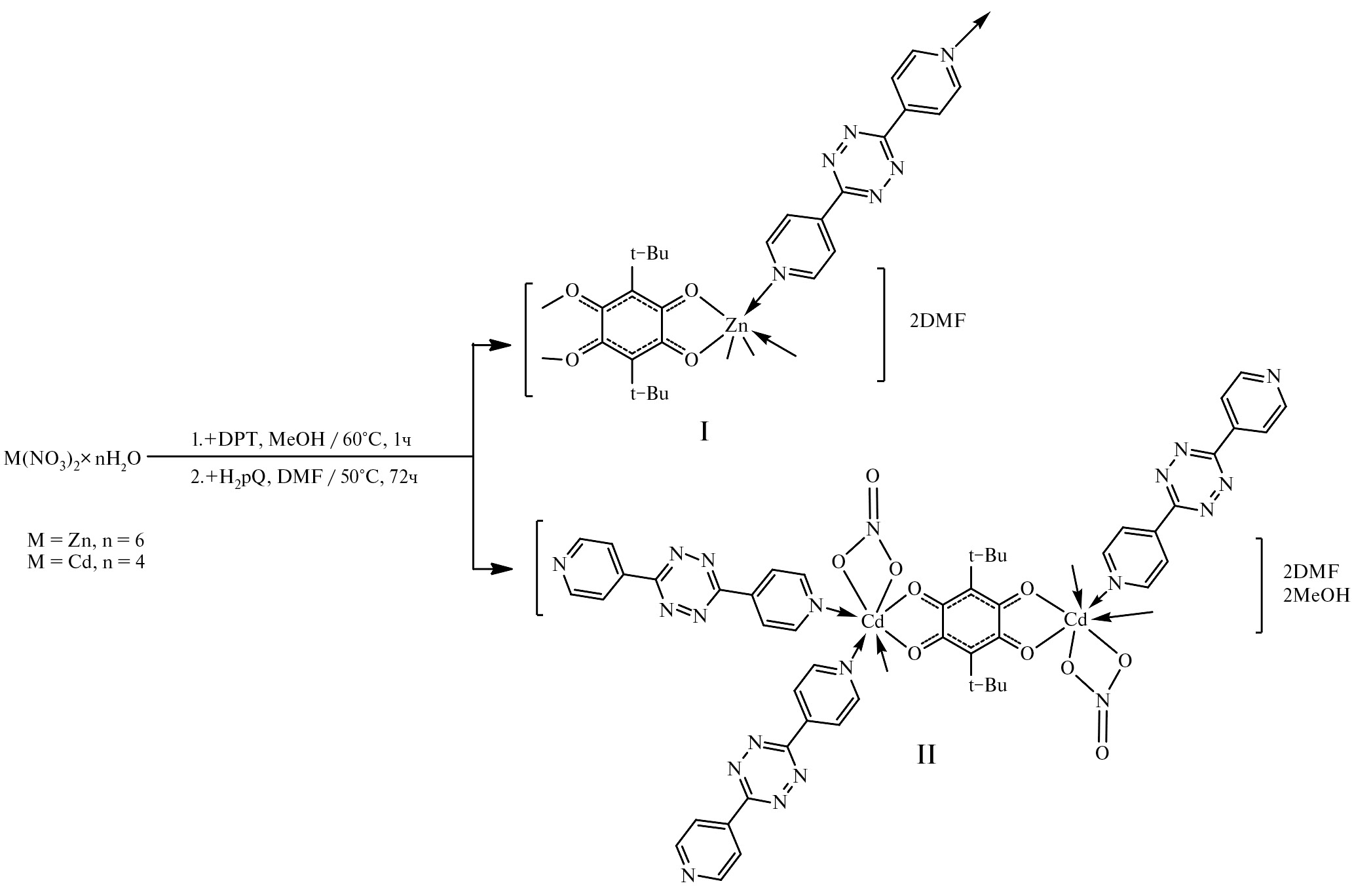 Методом двуступенчатого термального синтеза получены два новых гетеролептических металл-органических координационных полимера цинка и кадмия состава: [Zn(pQ)(DPT)] · 2DMF (I) и [Cd2(NO3)2(pQ)(DPT)3] · 2DMF · 2MeOH (II) (схема 2). На первой стадии синтеза в среде метанола происходит координация нейтральных N-донорных лигандов на ион металла. Далее в реакционную смесь вводится растворенный в среде DMF анилатный лиганд H2pQ. Нагревание полученной реакционной смеси в стеклянной виале проводили при 50°С в течение 3 суток.