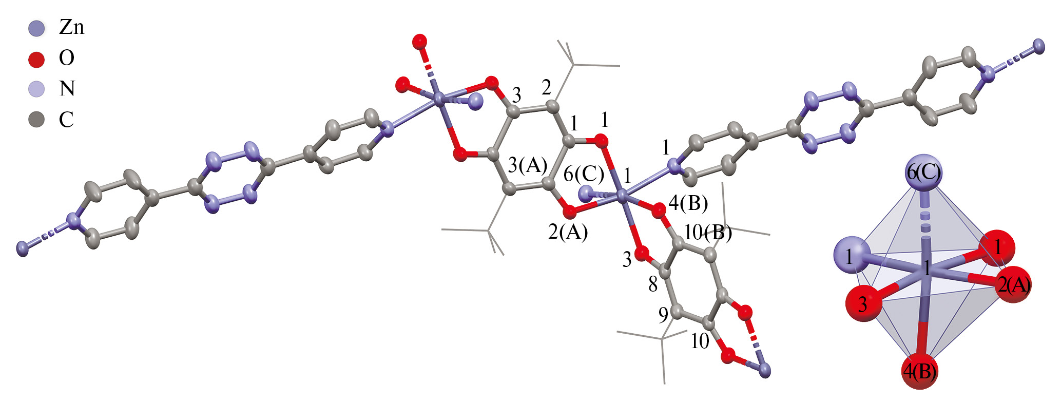 Цинк в [Zn(pQ)(DPT)] · 2DMF имеет шестикоординационное октаэдрическое окружение, образованное четырьмя атомами кислорода двух анилатных лигандов и двумя атомами азота двух тетразиновых линкеров (рис. 1). Кадмий в [Cd2(NO3)2(pQ)(DPT)3] · 2DMF · 2MeOH имеет координационное число, равное семи (рис. 2). Элементарное звено формируется путем связывания двух катионов кадмия депротонированным мостиковым дигидрокси-пара-хиноновым лигандом. При этом на атомах металла сохраняется по одной нитратной группе, а дополняют координационную сферу металла три мостиковых бис(пиридил)тетразина. Координация дополнительного нейтрального линкера на ион кадмия хорошо согласуется с увеличением ковалентного радиуса металла в сравнении с цинком (r(Cd) = 1.44 Å, r(Zn) = 1.22 Å [68]). Координационное окружение кадмия представляет собой искаженную пентагональную бипирамиду, экваториальную плоскость которой формируют кислородные атомы одного анилатного лиганда, два кислорода бидентатно связанного нитрат-аниона и один атом азота тетразинового лиганда. В вершинах пирамиды расположены атомы азота двух других тетразиновых линкеров.