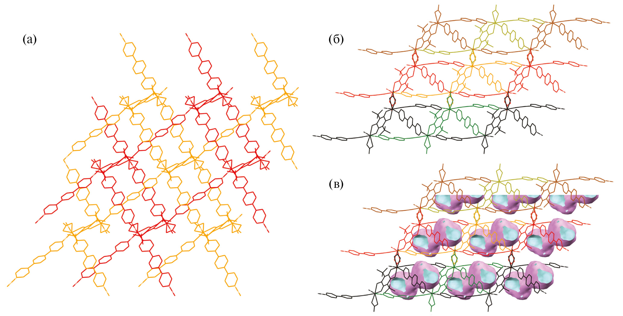 Рис. 4. Вид пары взаимопроникающих сетей МОКП II вдоль вектора (100) (а); слои, образованные попарно взаимопроникающими сетями в кристалле вдоль вектора (010) (б); вид пор в II вдоль вектора (010) (в). Внешняя сторона пор — розовая; внутренняя сторона — голубая. "Гостевые" молекулы DMF и MeOH не изображены.