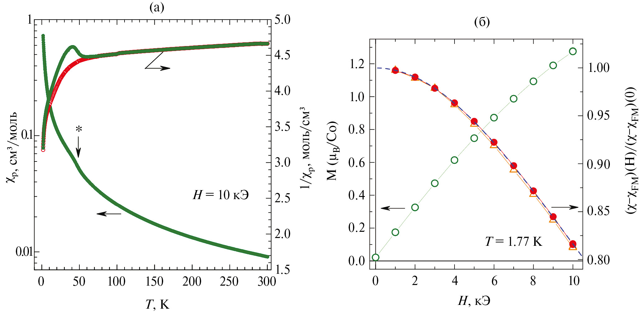 Образец моноядерного соединения I демонстрирует похожие магнитные свойства (рис. 7а) с эффективным моментом meff, изменяющимся от ≈ 4.67 до ~3.5 mВ при охлаждении от 300 до 1.77 К. Анализ зависимостей χp(T) и mэфф(T) несколько осложнен наличием примесной ферромагнитной (ФМ) фазы с температурой Кюри Tc ~ 50 K в количестве ~0.7 мол. % (отмечена звездочкой на рис. 7а). Исключить вклад ФМ фазы относительно просто: при нескольких температурах проводятся измерения полевых зависимостей намагниченности M(H), которые раскладываются на ФМ, MFM, и парамагнитную компоненты, затем температурная зависимость MFM(T) аппроксимируется и вычитается из значений полной намагниченности. На рис. 7б показано, что даже при минимальной температуре Т = 1.77 К кривая M(H) легко раскладывается на остаточную намагниченность M0 ≈ 0.021 mВ/Co, связанную с ФМ фазой, и парамагнитную компоненту с магнитной восприимчивостью χ(H), хорошо описывающейся зависимостью на основе функции Бриллюэна Bs(x):